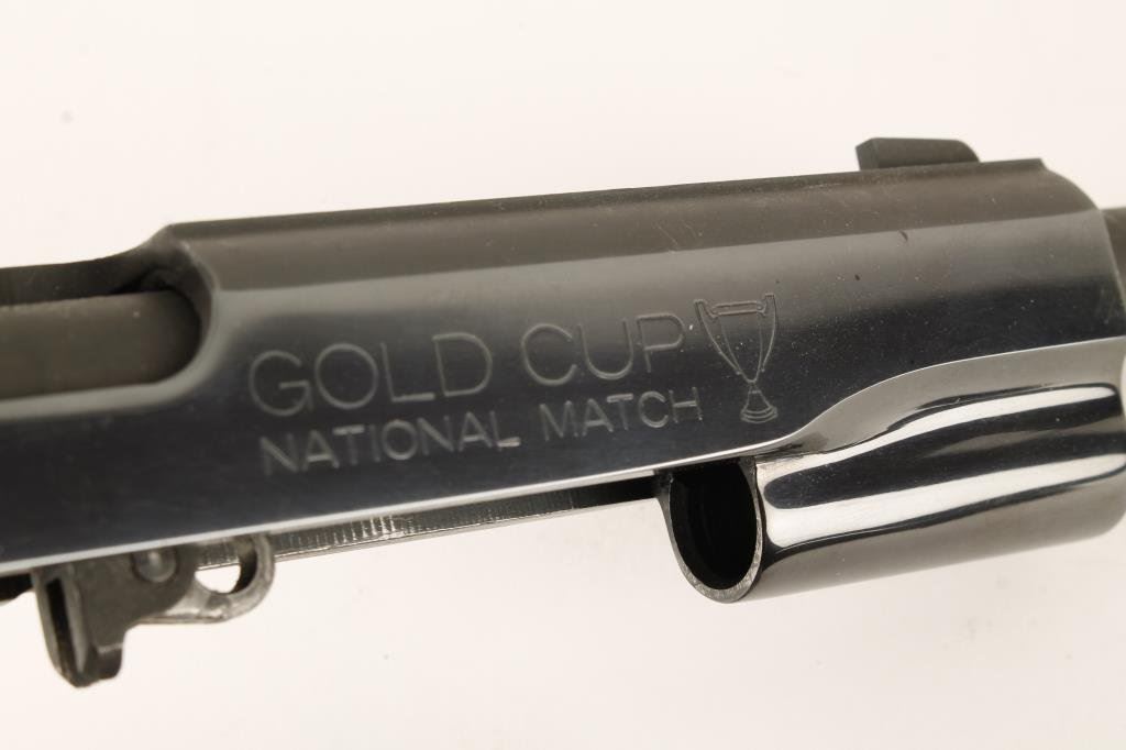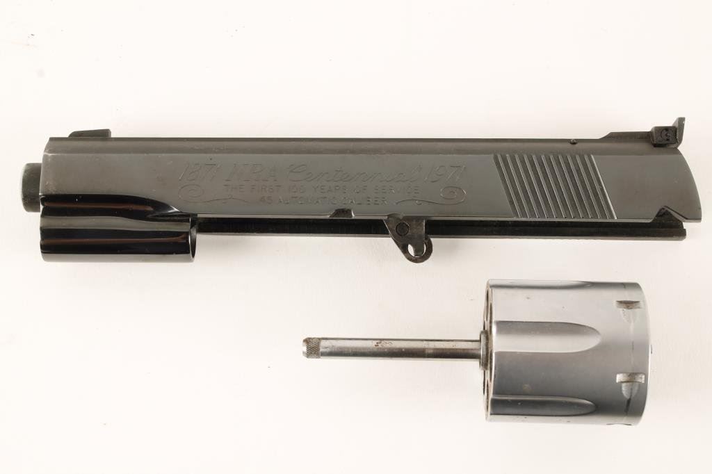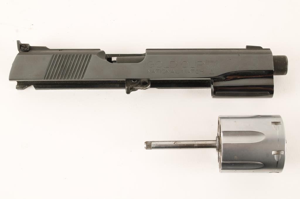 Lot consisting of an NRA Centennial Gold Cup National Match slide and barrel only in overall fine condition with some muzzle wear and a stainless steel cylinder and ejector rod only that appears to be for a .38 Special revolver, likely a Smith & Wesson. Est.: $75-$100.