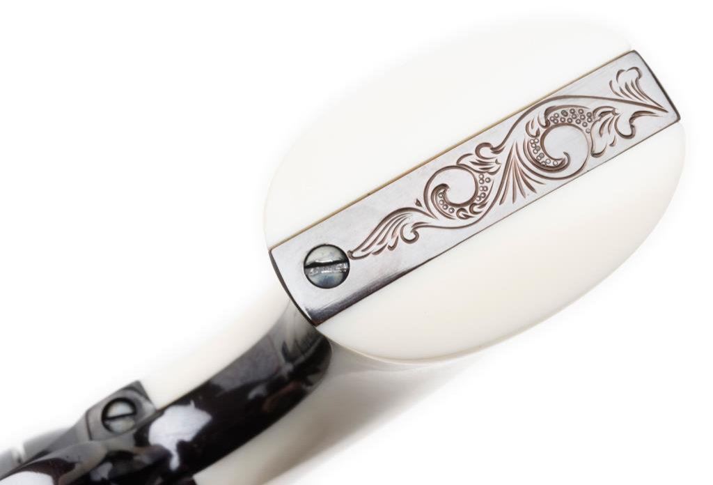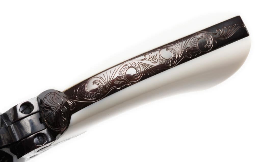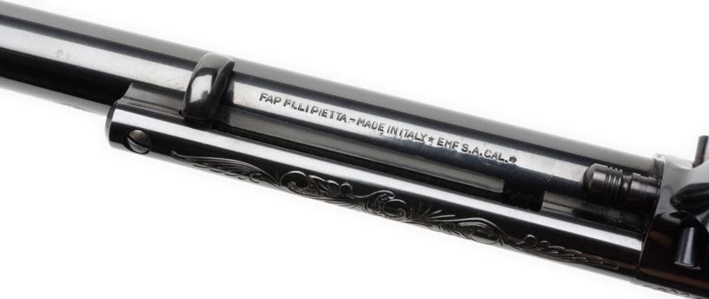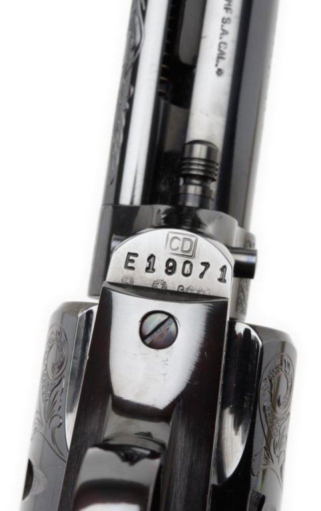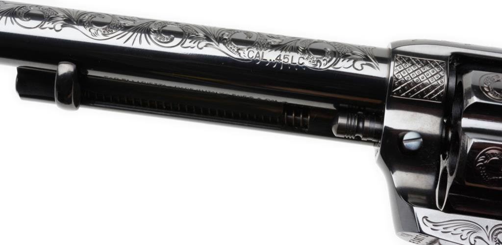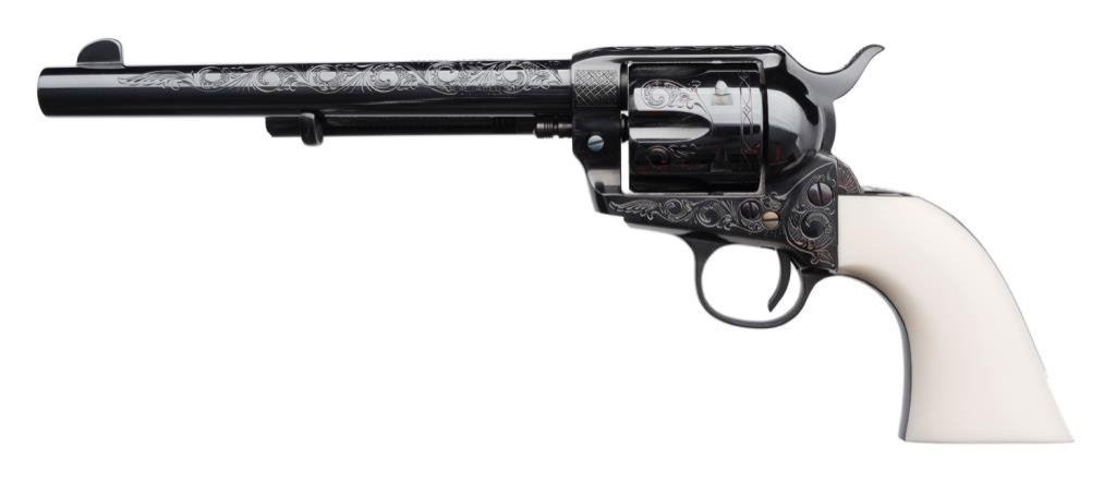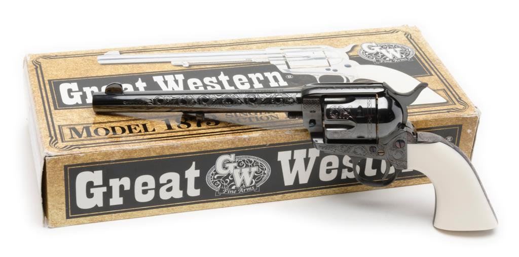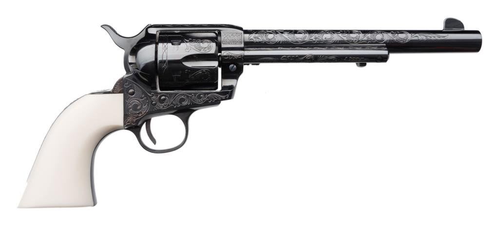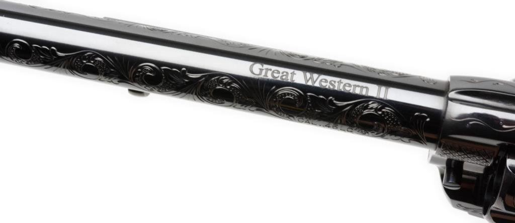 **EMF-Great Western II Single Action revolver, custom engraved by Jim Downing, .45LC caliber, 7.5” barrel, S/N E19071, custom high polish blue finish, tuned, honed and gunsmith re-fitted; simulated ivory grips; with factory cardboard box and inserts. This gun is in like new condition as customized, showing little handling. Accompanied by a color photo and Certificate from Downing. Est.: $900-$1,800.