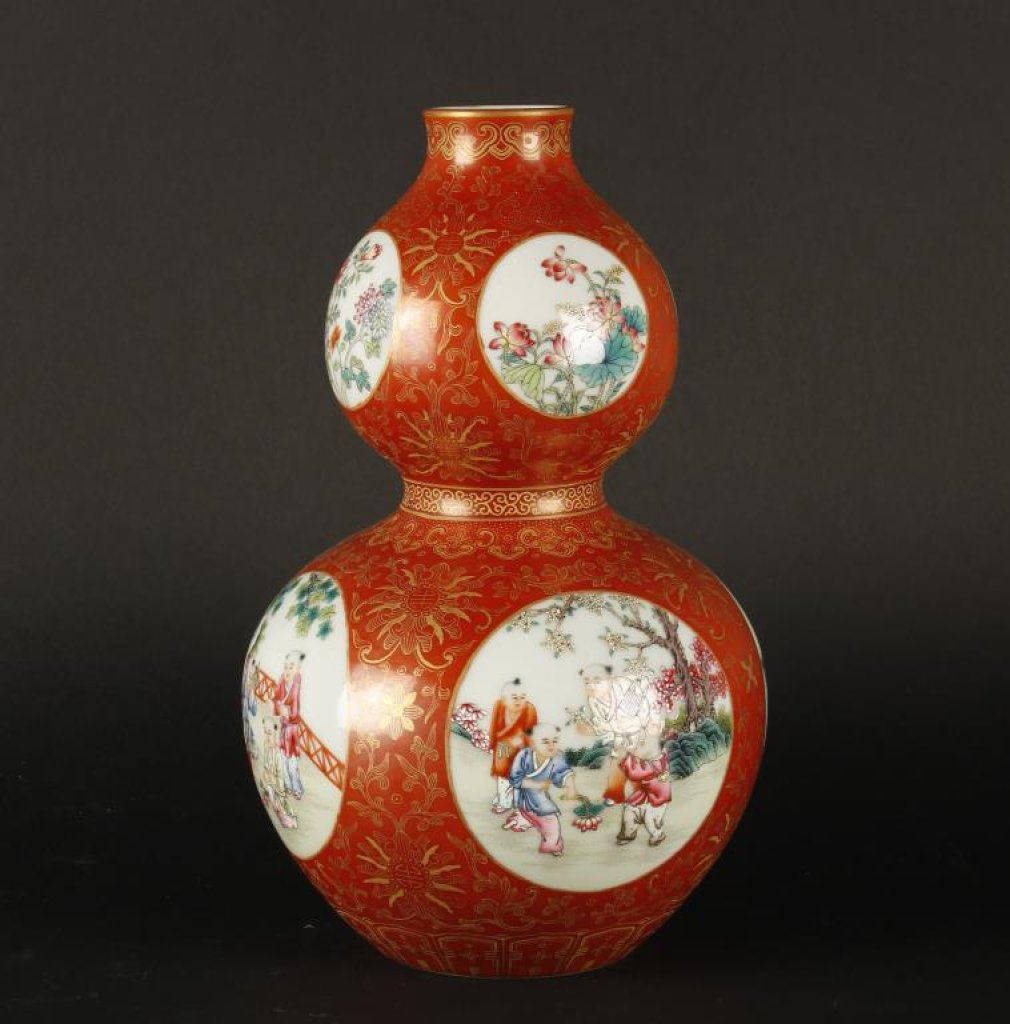 Double gourd shaped porcelain vase with panels of children and florals; eight panels; Quan Long marked; ca 18th Century. Est.: $1,000-$2,000.