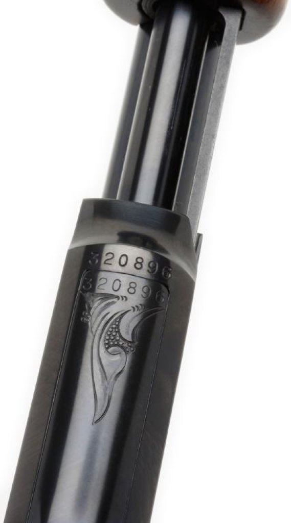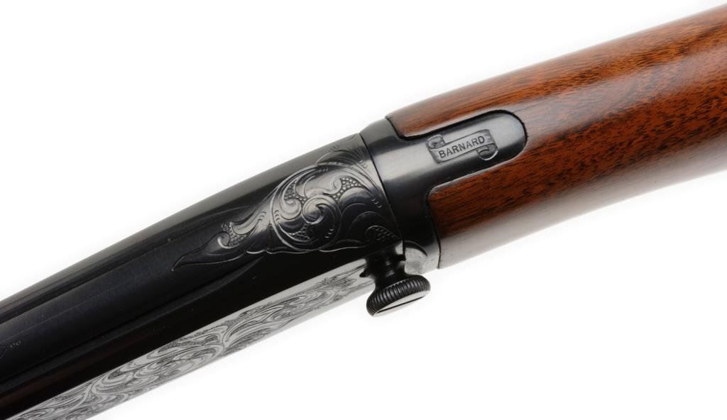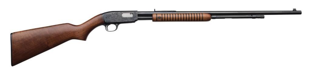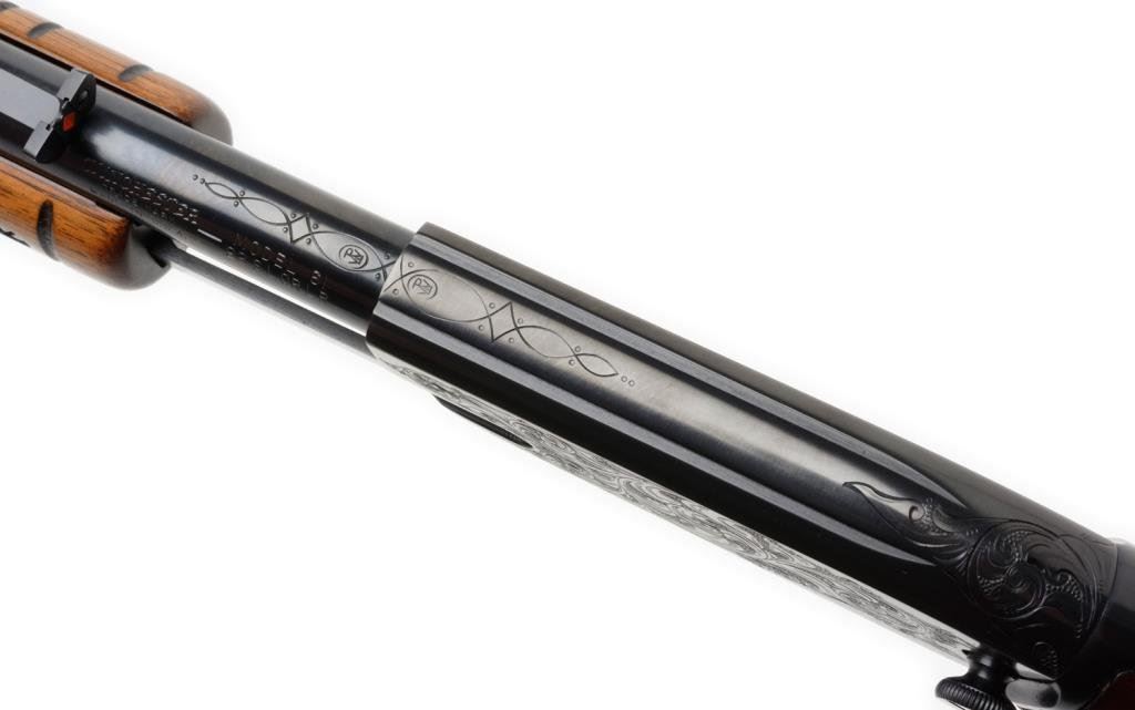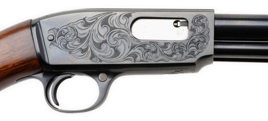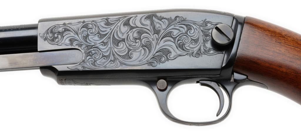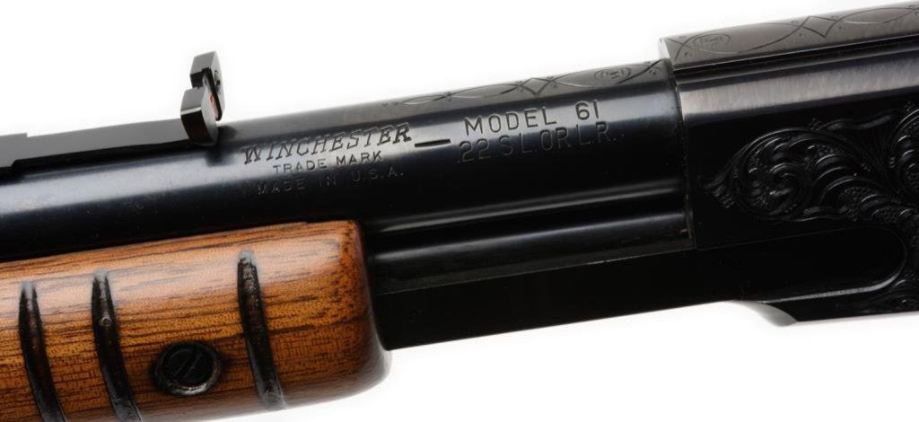 **Engraved Winchester Model 61 pump action rifle, .22 short, long or LR caliber, 24” round barrel, S/N 320896, blued finish, wood stocks, checkered Winchester black butt plate. This gun is in overall excellent condition as custom engraved by noted artist Barnard and signed on the upper tang. The bore is fine, the action and markings are crisp and the wood is also fine. Barnard’s scroll engraving is on both sides of the receiver, rear of barrel at breech, bottom of frame and bottom of trigger guard. Est.: $700-$1,400.