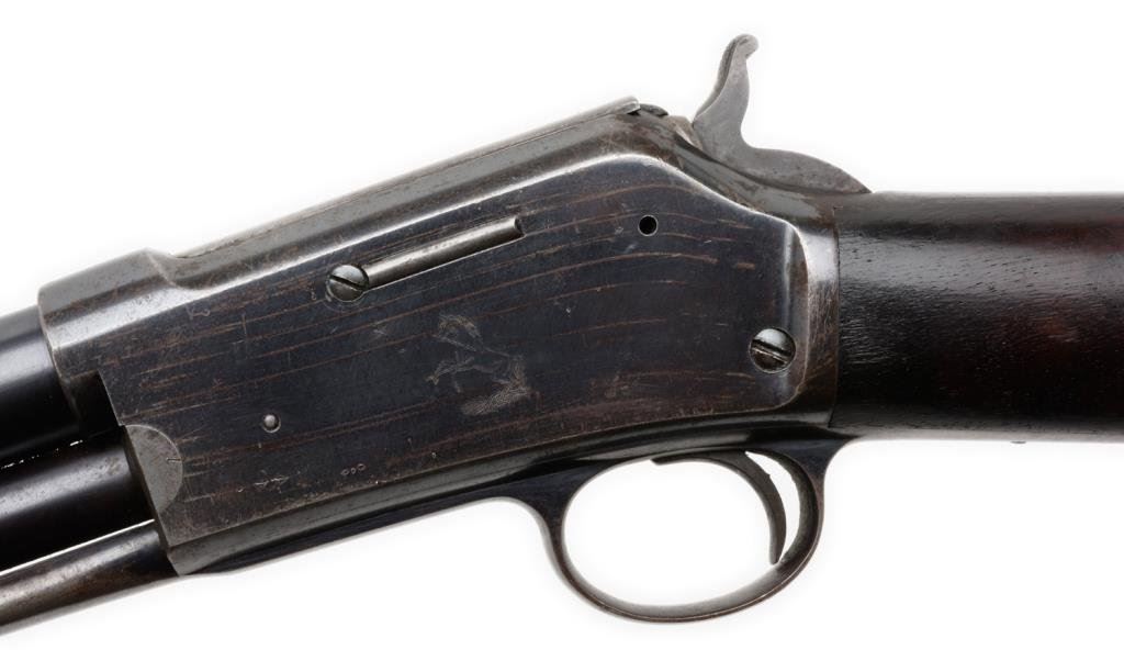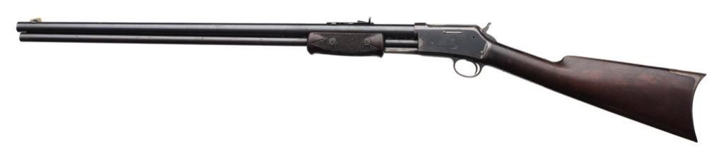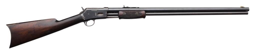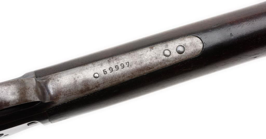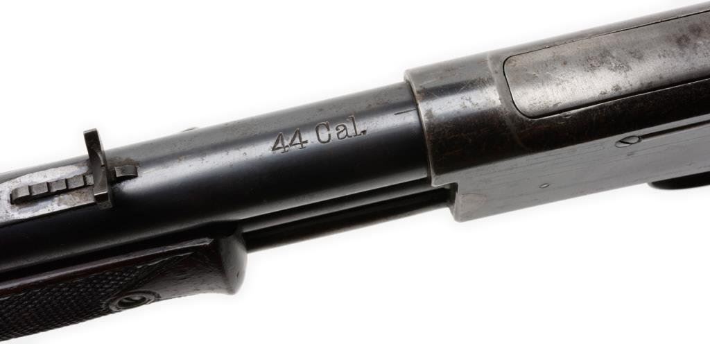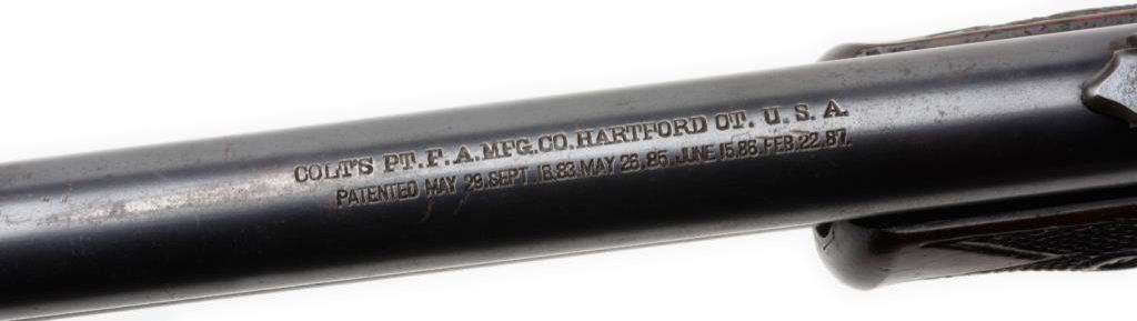 Colt Medium Frame Lightning pump action rifle in desirable .44-40 caliber, 26” round barrel, S/N 59997, blued finish wood butt stock with checkered forend. This Colt rifle is in overall fine condition displaying the majority of its original finish, fine bore, crisp action and markings. The wood is overall very good + to fine with a couple old mars to the butt stock from storage and a very small chip to the rear edge of the forend. A really nice Lightning rifle in the most popular Medium Frame caliber. Est.: $2,000-$4,000.