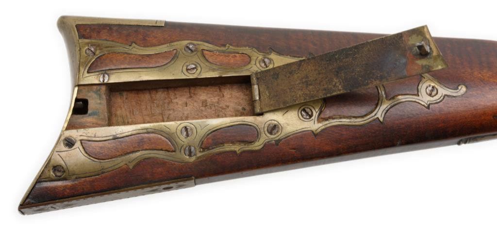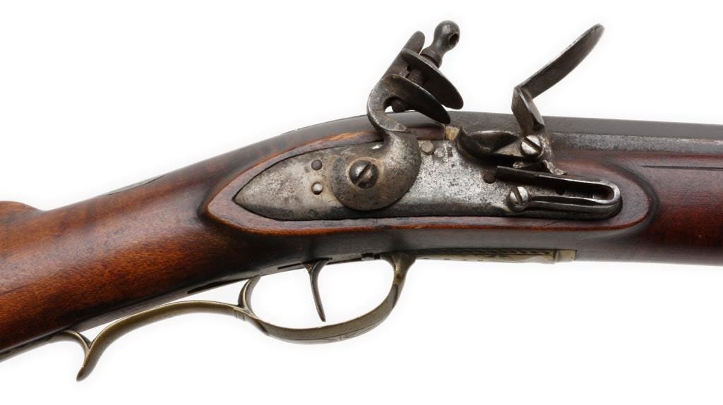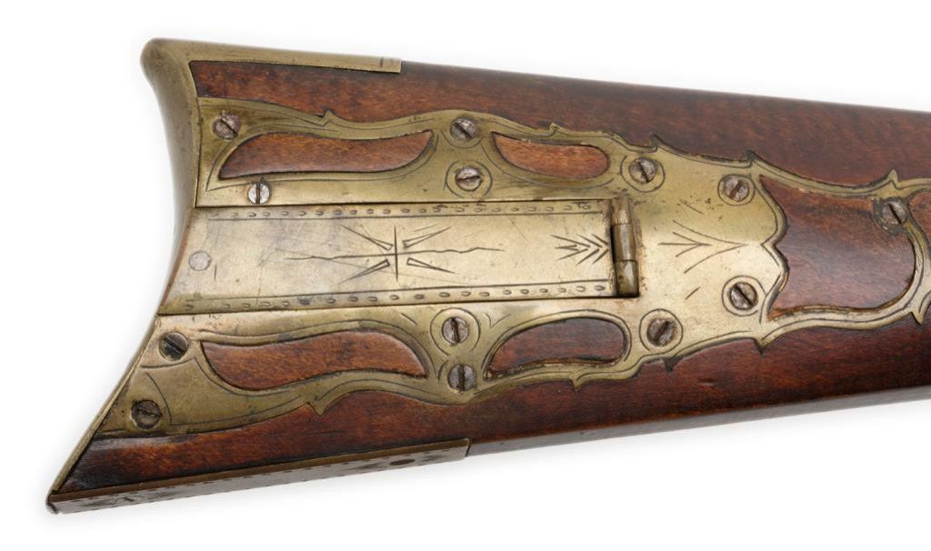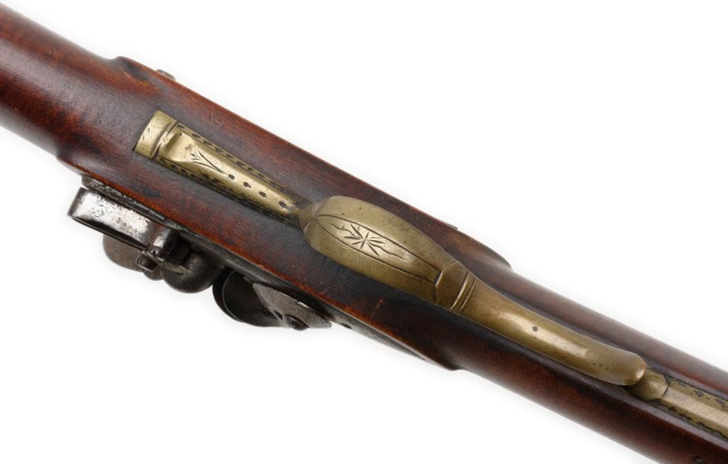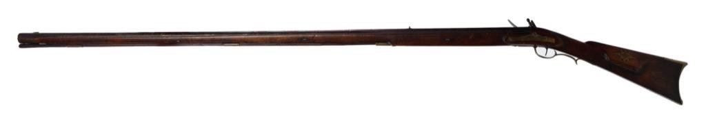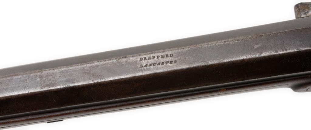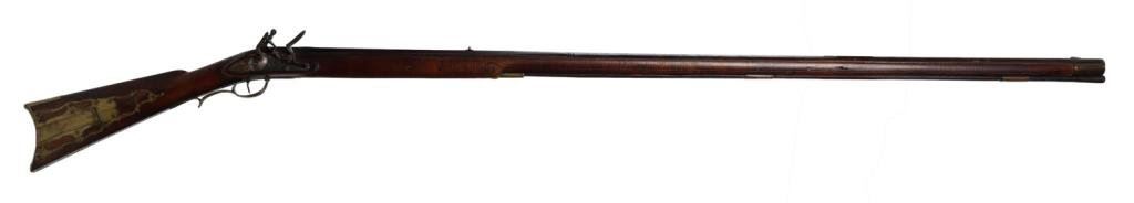 Full stocked flintlock rifle .70 caliber, 54” barrel marked “DREPPERD, LANCASTER”; brass furniture including trigger guard, engraved patchbox and butt plate with wood ramrod retained. This massive early rifle is in overall very good condition showing a dark patina to the barrel and lock mechanism; pleasing patina to brass parts, strong action, very good + stock displaying some very minor mars and scratches from storage. Est.: $2,000-$3,000.