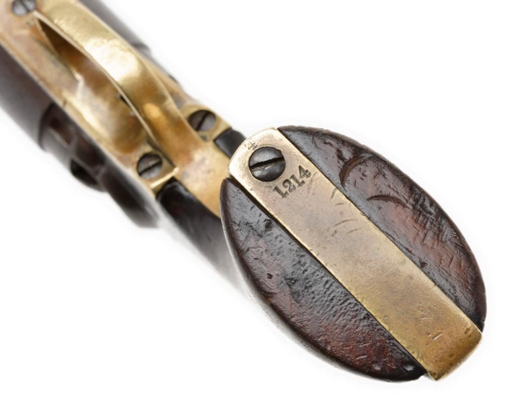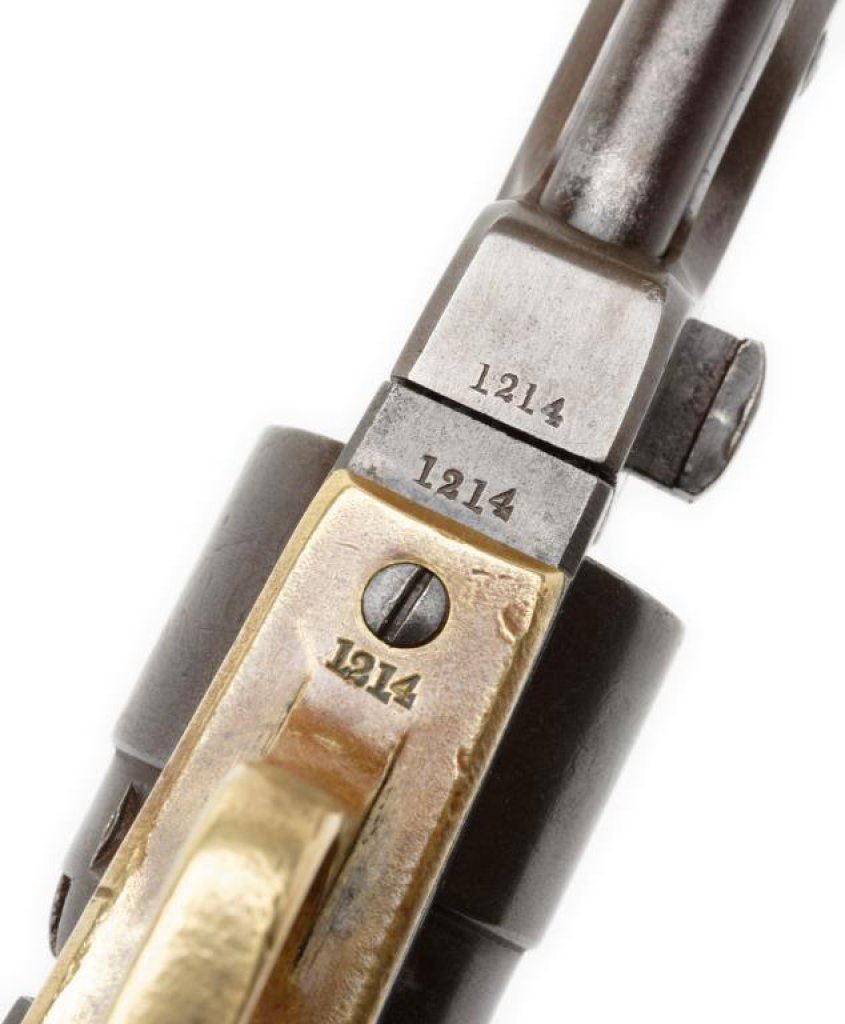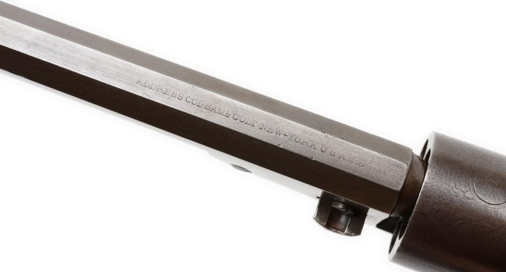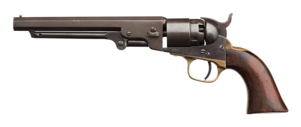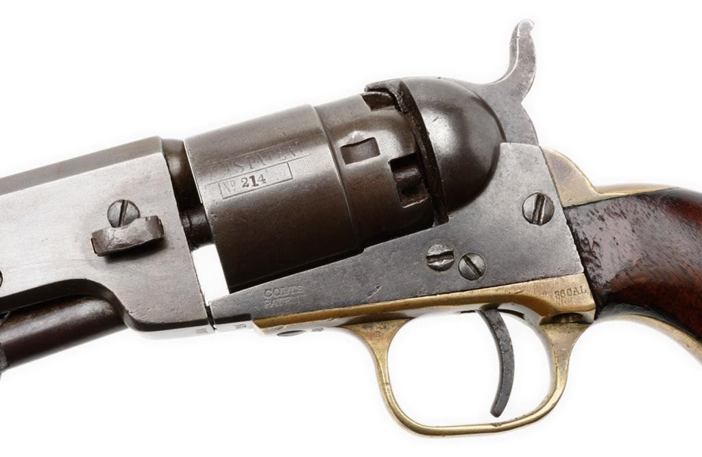 Colt Pocket Navy percussion revolver, .36 caliber, 6.5” octagon barrel, New York address, S/N 1214, matching visible numbers, un-numbered rammer, brass straps, wood grips. This gun is in overall good to very good condition showing a plum brown patina on metal surfaces, partially visible cylinder scene, action is working but needs slight timing adjustment; grips are good to very good with wear and some old minor mars and dings from carry and storage; desirable to collectors in the long barrel and harder-to-find Navy Pocket Model. Est.: $700-$1,400.