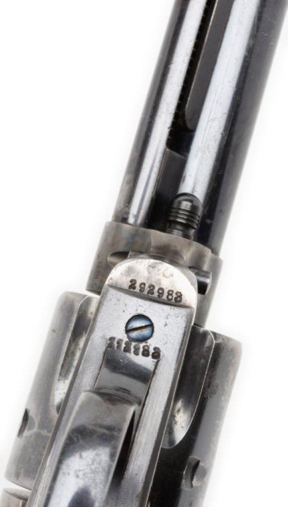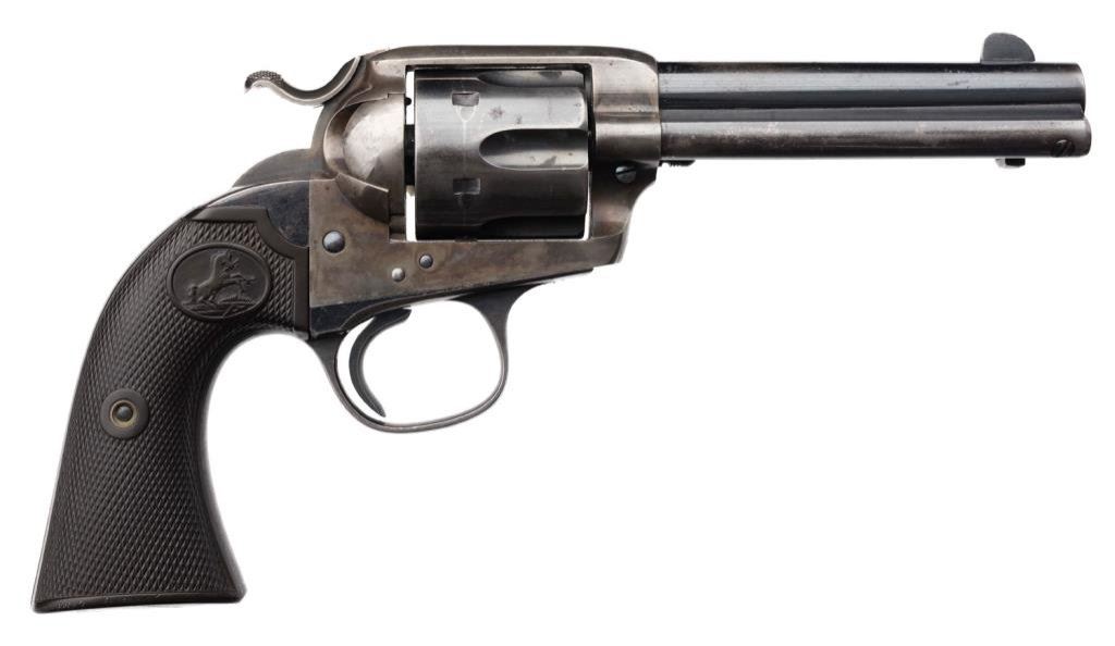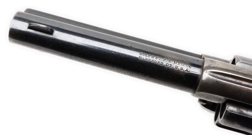 Colt Bisley Model Single Action revolver, .44-40 caliber, 4.75” barrel marked “(BISLEY MODEL ) COLT FRONTIER SIX SHOOTER”, S/N 292983, blued and case hardened finish, checkered black hard rubber grips. This desirable caliber and barrel length Bisley is in overall very good to fine condition displaying considerable original blue finish and case hardening on the frame with some mixing of silvery tone. The bore is fine, the action and markings are crisp and the grips are very good with old “X”s carved into the bottom of each grip. Est.: $3,000-$5,000.