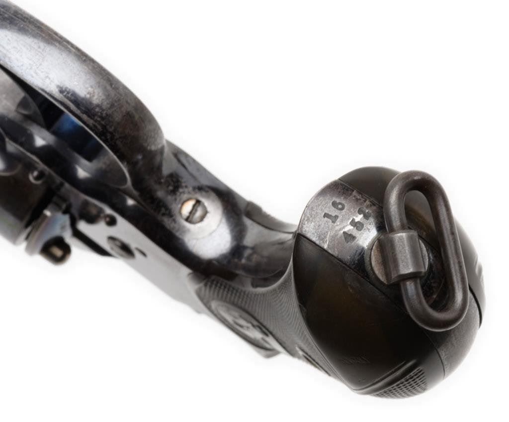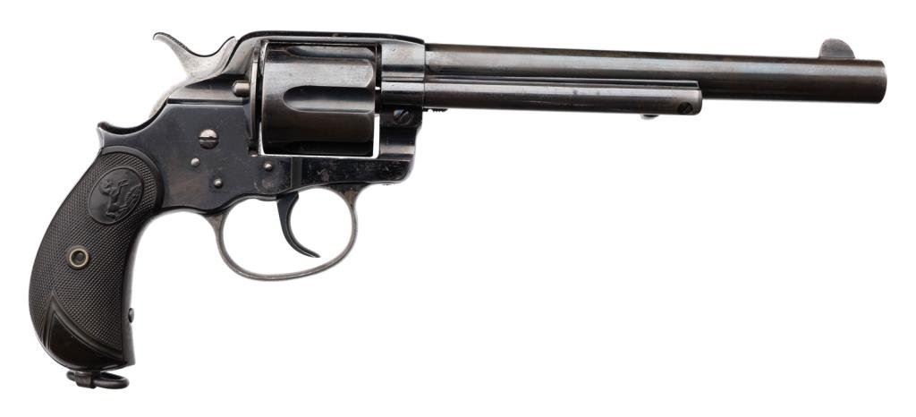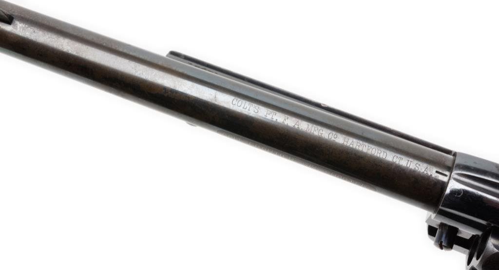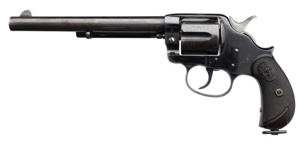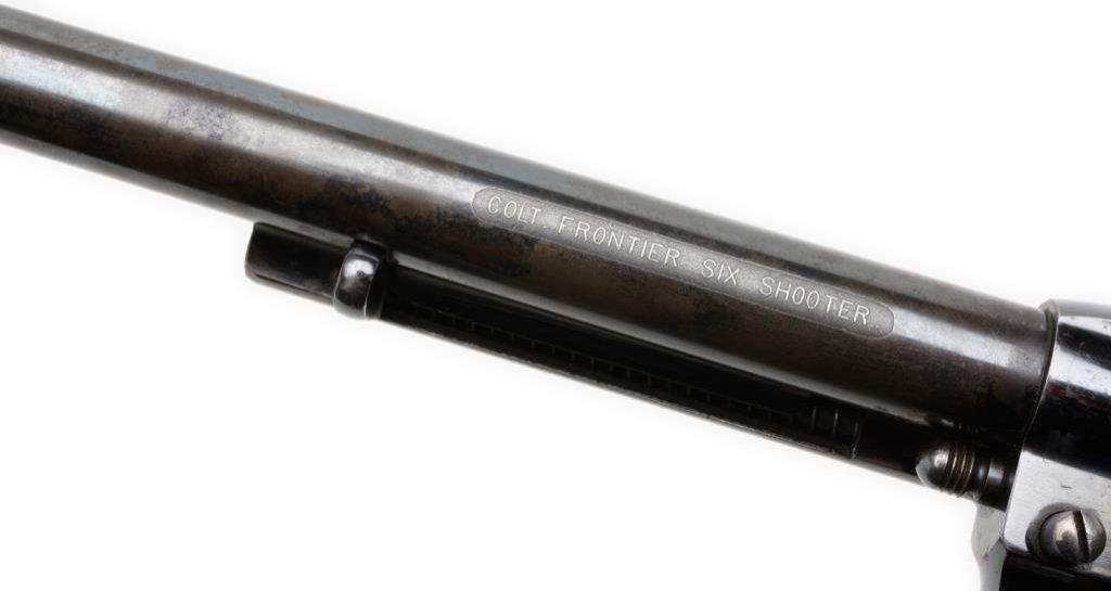 Colt Model 1878 DA revolver, .44-40 caliber, 7.5” barrel, S/N 16452, blued finish, etched barrel panel “COLT FRONTIER SIX SHOOTER”, checkered black hard rubber grips with lanyard ring. This gun is in overall fine condition displaying considerable original bright blue finish, just some flaking on the barrel; the majority of its niter blue finish remains on the hammer and trigger; full etched panel, crisp action, sharp markings and fine bore. The grips are also in overall fine condition. Est.: $2,500-$4,500.
