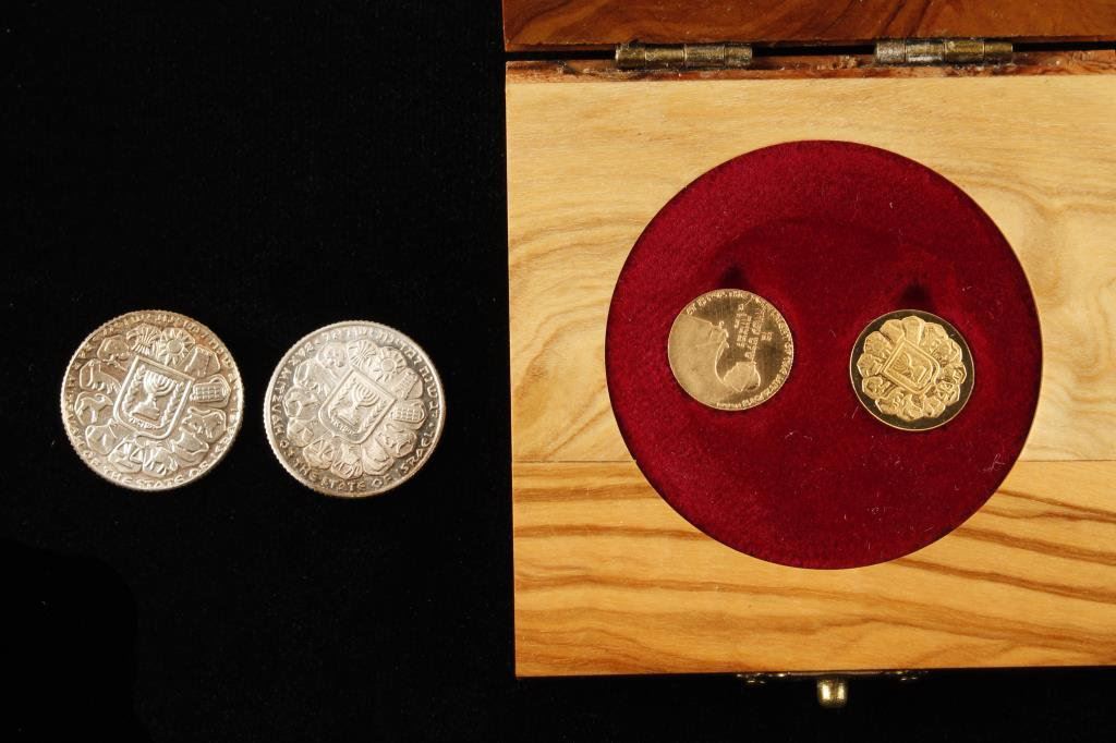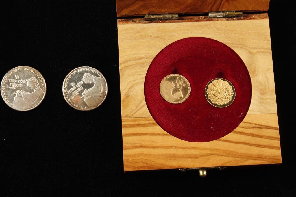Lot of two Israeli Gold Bar Mitzvah and Bat Mitzvah 1978 state medals. The medals are gold/.900, 13 mm and 1.7 grams each, with a milled edge. The medals are ungraded and come in the original olive wood presentation box. Additionally, the lot includes two examples of the 1978 Bar Mitzvah state medal in .935 silver. The silver medals are ungraded as well showing some tarnish. A nice set of Israeli minted state medals. Est.: $150-$300.