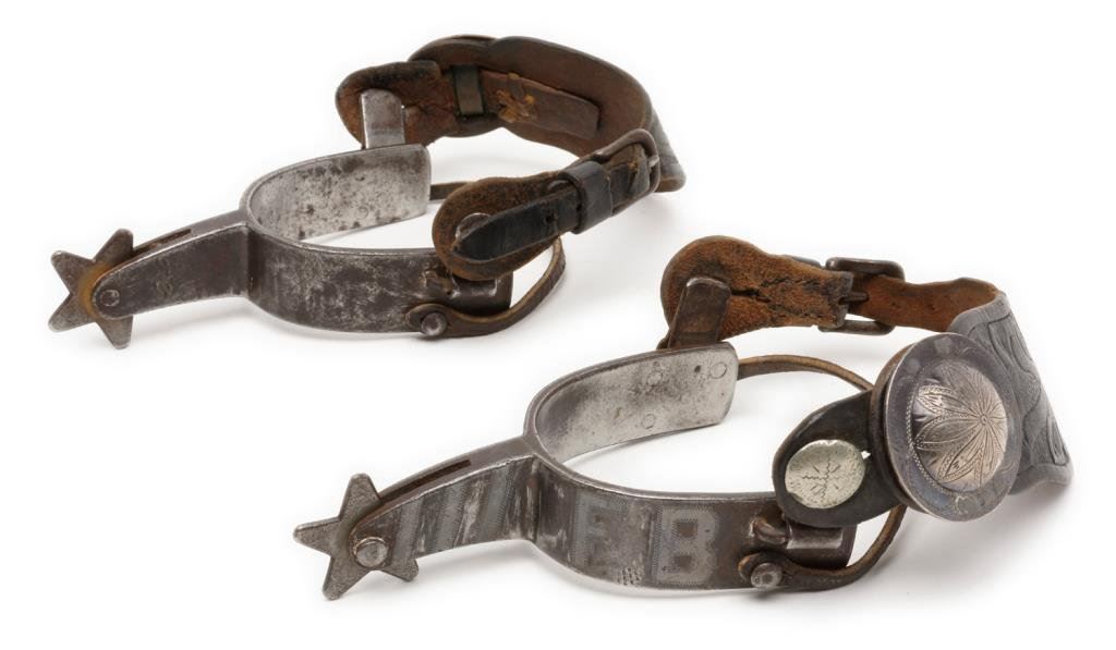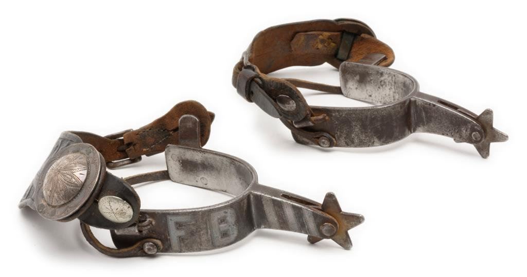 Pair of heavy spurs marked “CROCKETT” on one spur with silver overlays and initials in silver “F B” on each spur; 1-3/4” 5 point rowels with black tooled leather straps displaying 2-1/4” conchas. Desirable maker. Est.: $600-$1,200.