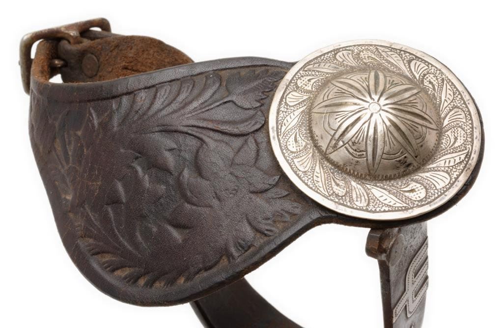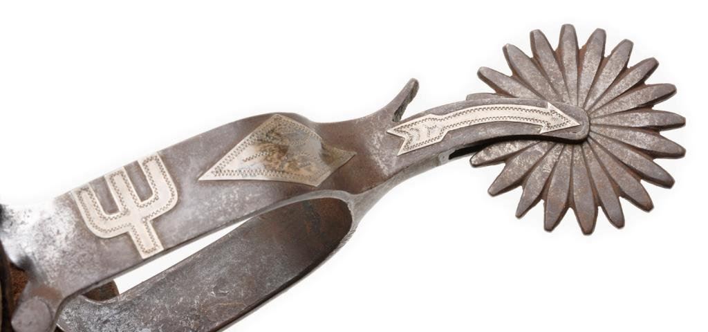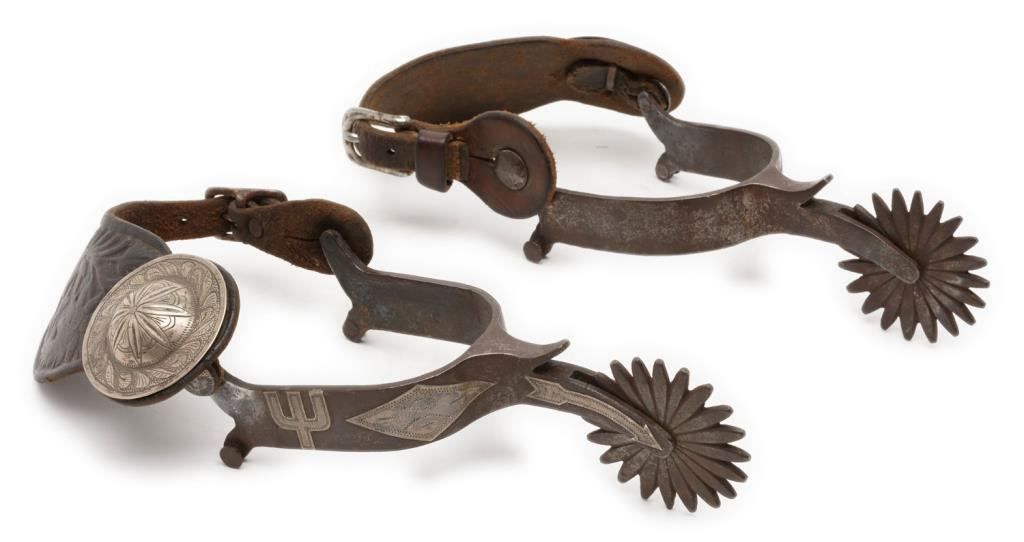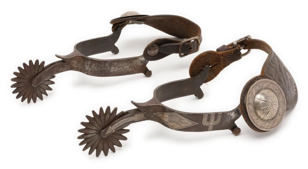 Pair of silver engraved and overlaid spurs with 2-3/4” 20 point rowels, no visible maker’s markings. Overlays include diamonds, cactus and arrows. Great patina; accompanied by tooled leather straps with large 2-1/2” engraved conchas. Est.: $400-$800.