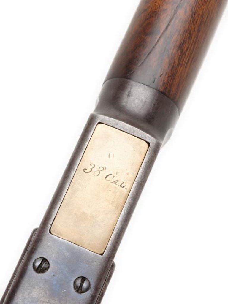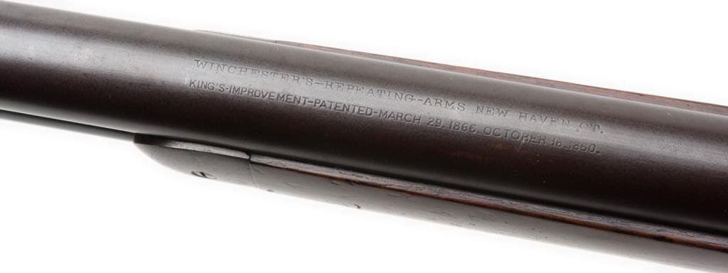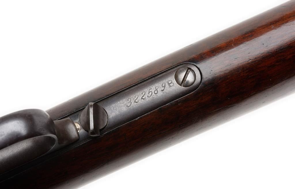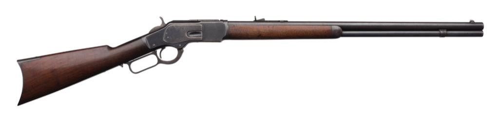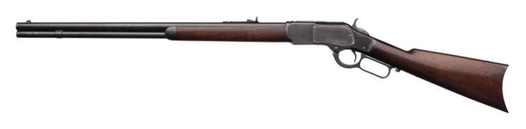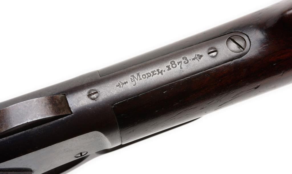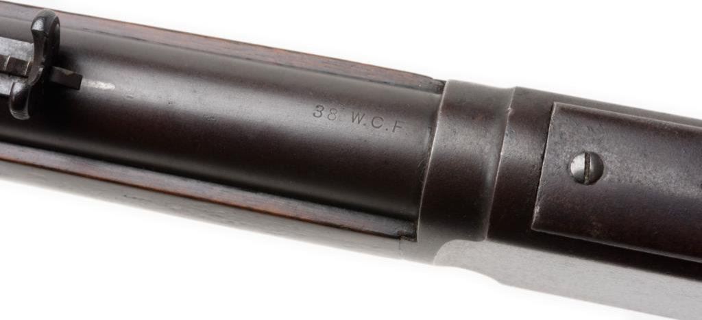 Winchester Model 1873 lever action rifle, 38-40 caliber, 24” round barrel, S/N 322589B, blued finish, wood stocks in overall very good to near fine condition displaying the majority of its original finish on the receiver and considerable original blue finish on the loading tube and barrel mixed with a pleasing plum brown patina; very good to fine bore, crisp action, sharp markings, very good + wood stocks with considerable original varnish remaining; some scattered old mars and scratches from storage. Est.: $2,500-$5,000.