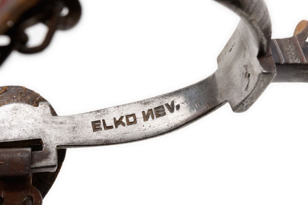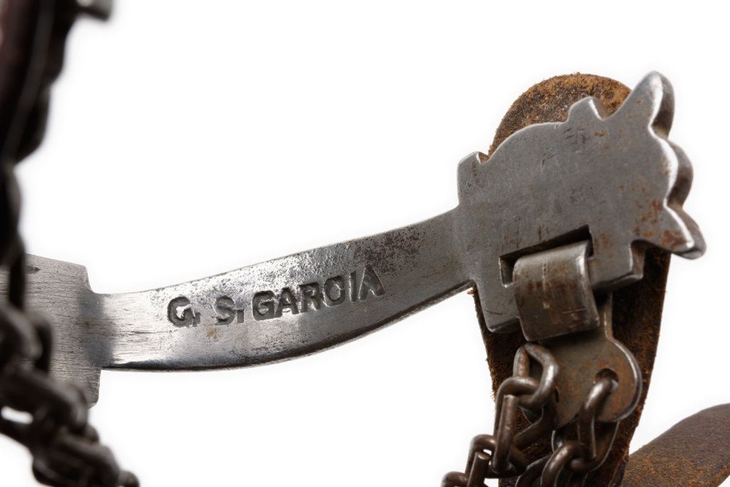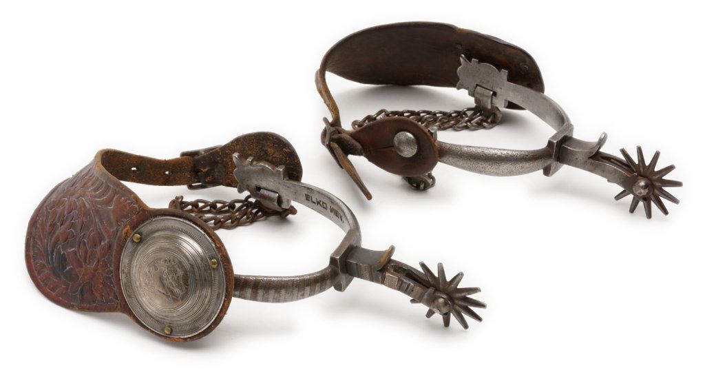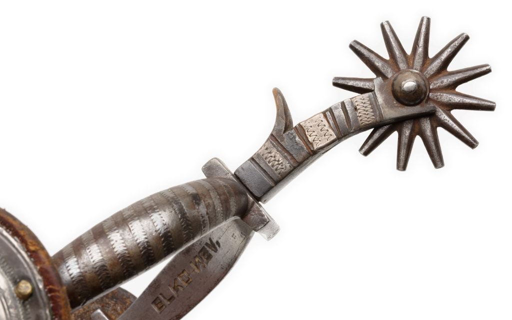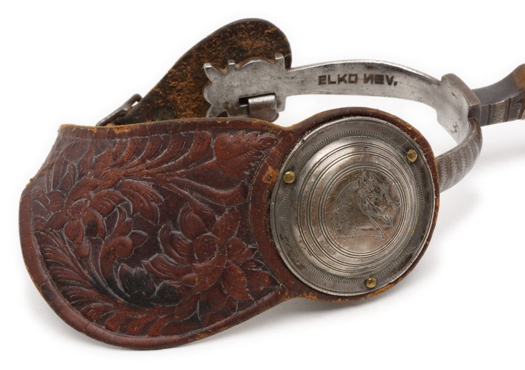 Squared pair of stirrups with silver overlays including images of a horse head, approx. 4-3/4” wide and 5-1/4” in height, dark patina and leaf pattern engraving. Est.: $250-$500.