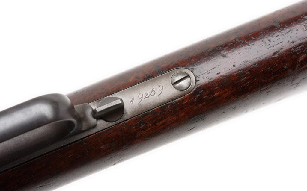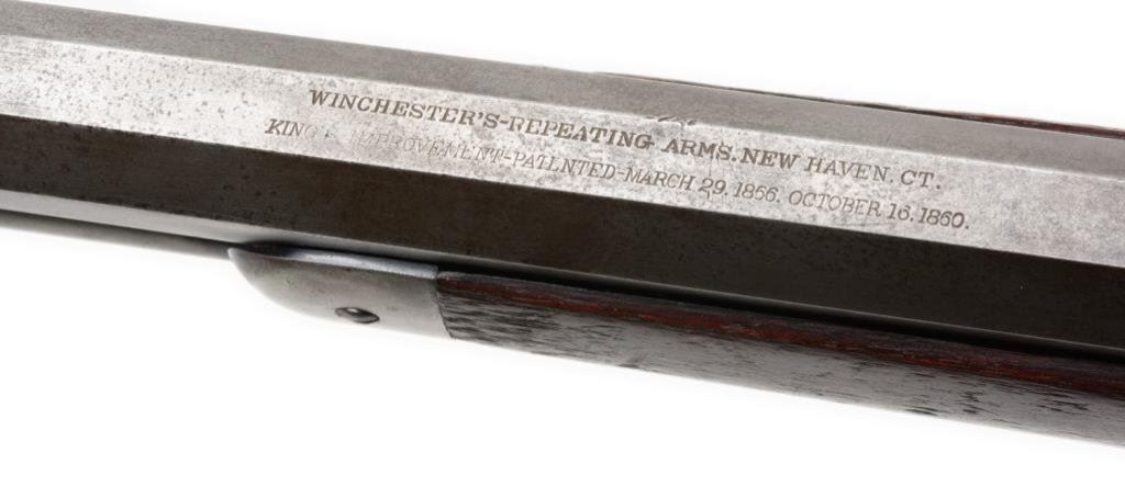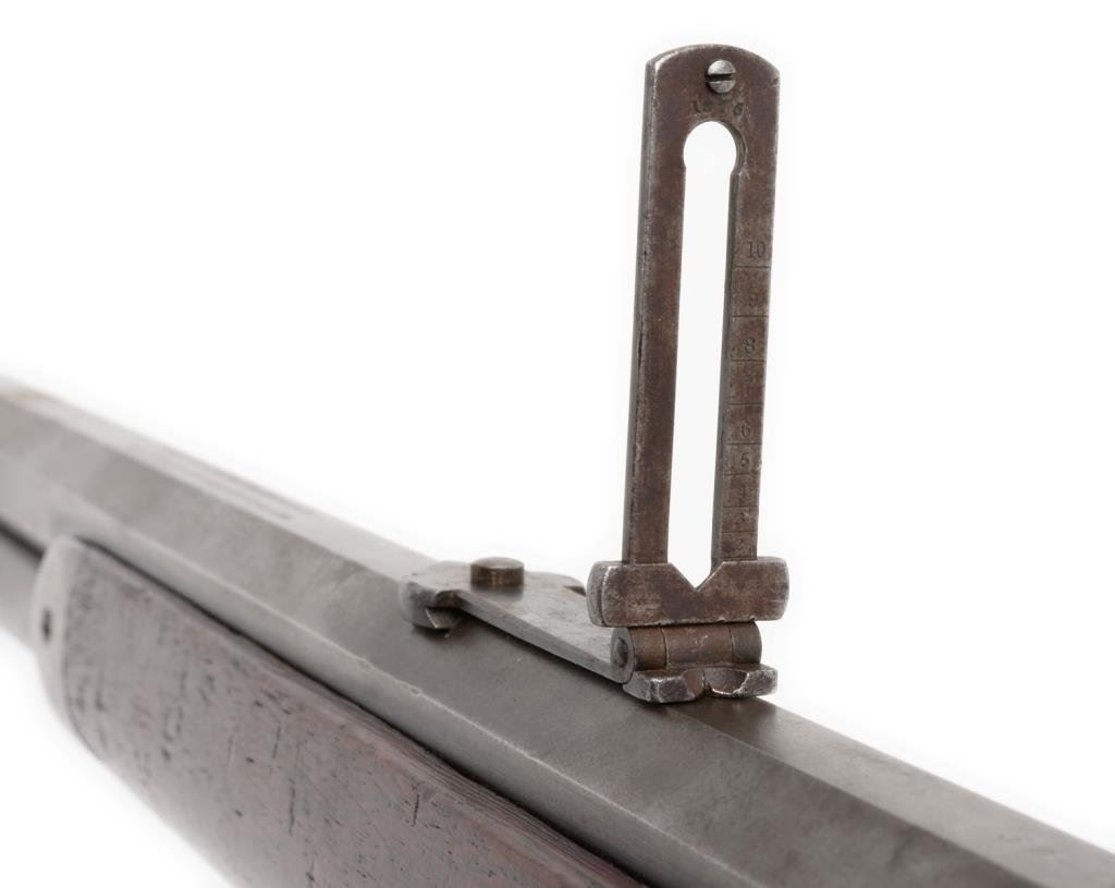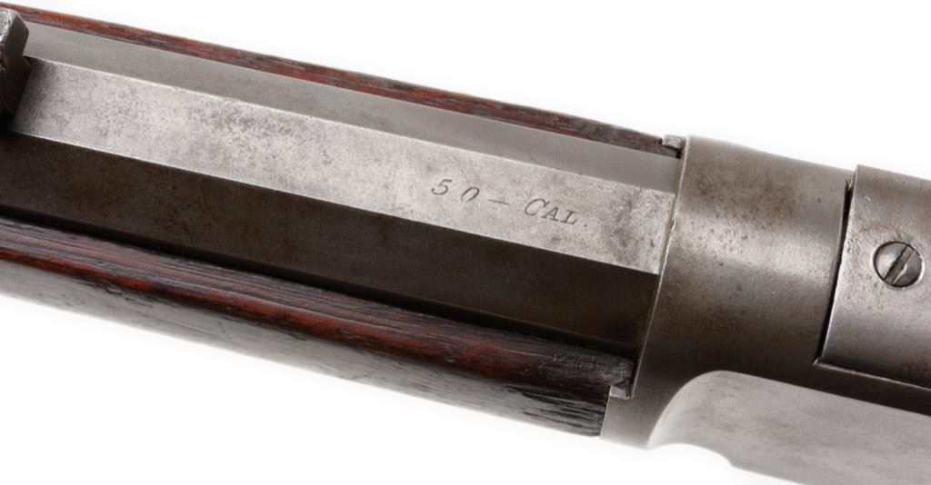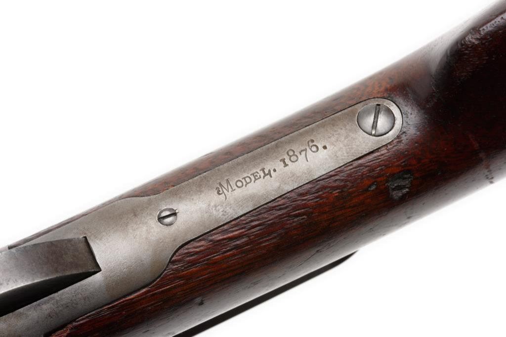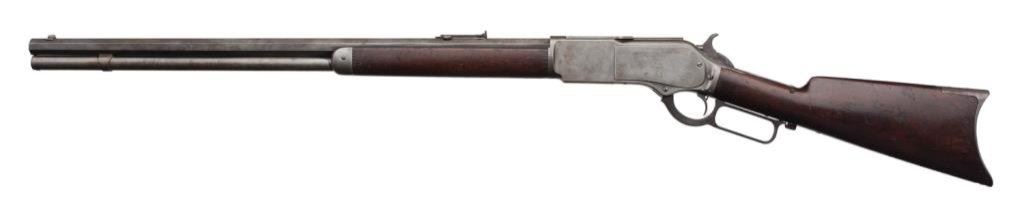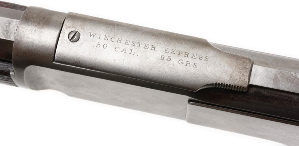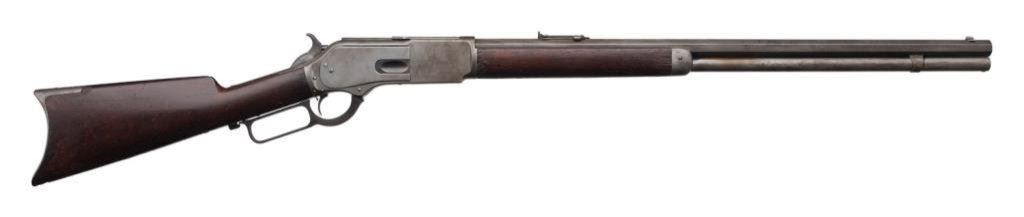 Desirable Winchester Model 1876 lever action rifle in .50-95 Express caliber, 26” octagon barrel, S/N 19259, blued finish, set trigger, wood stocks in overall very good condition showing a grey patina to metal surfaces with traces of original blue in protected areas of barrel; crisp action, set trigger working at time of description, good bore, sharp markings and good wood displaying scattered old mars, dings and scratches from carry and storage. Original factory letter confirms all features and indicates received in warehouse on February 21, 1881 with shipment on November 23, 1881 to order number 29682. Est.: $5,000-$10,000.