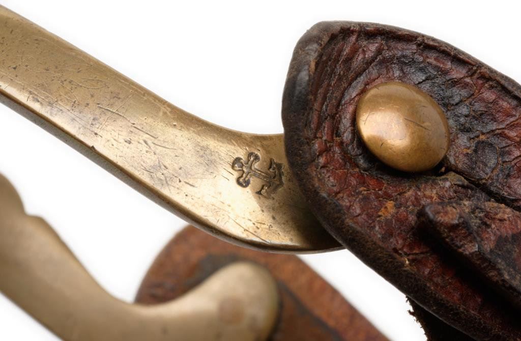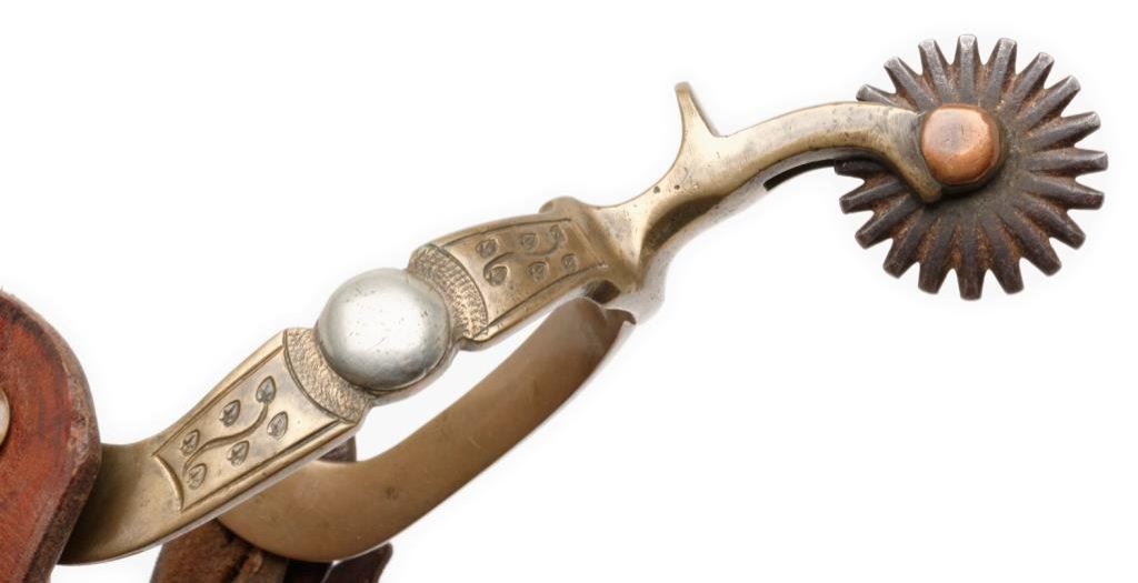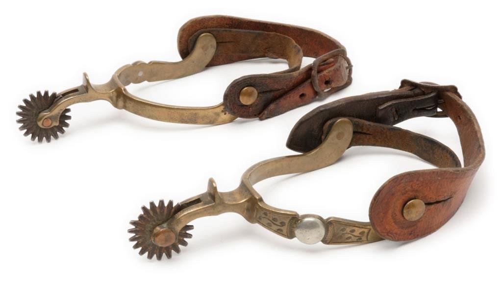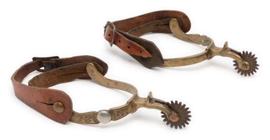 Pair of engraved brass spurs with 1-1/2” 20 point rowels; each spur marked with an anchor stamp at the end of one of the heel bands. Accompanied by plain leather straps. Est.: $300-$600.