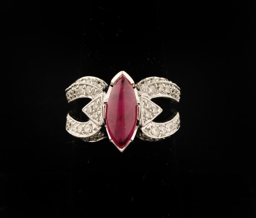 Lot 210 One 18k white gold ruby and diamond ring set with a marquee ruby cabochon