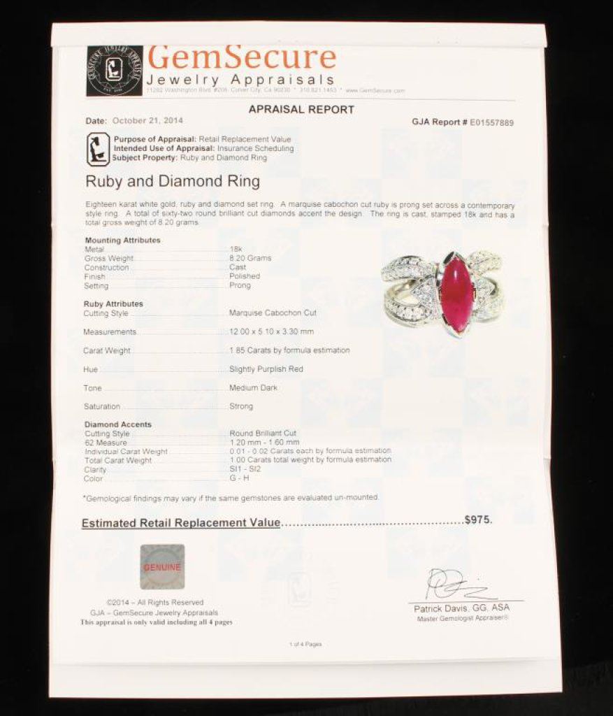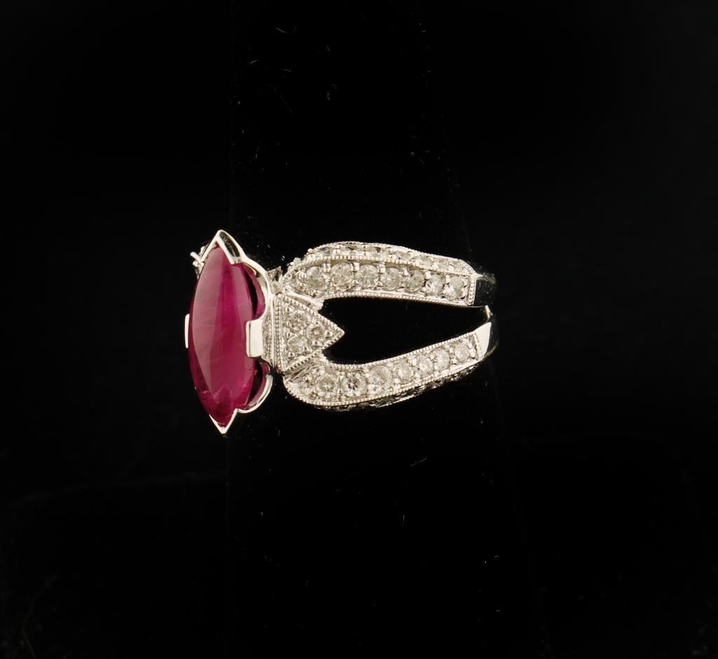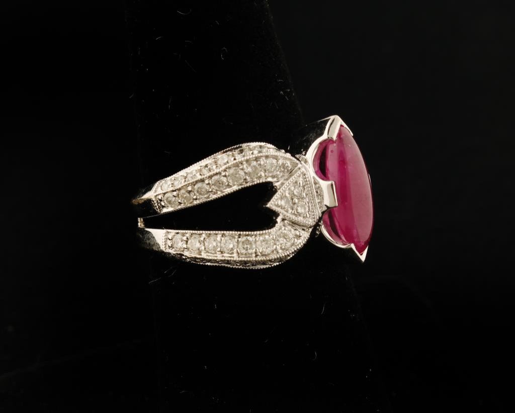 One 18k white gold ruby and diamond ring set with a marquee ruby cabochon and 1 ct of diamonds Est. Retail Value $1000-1200