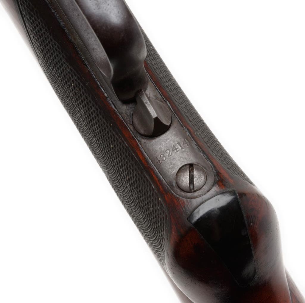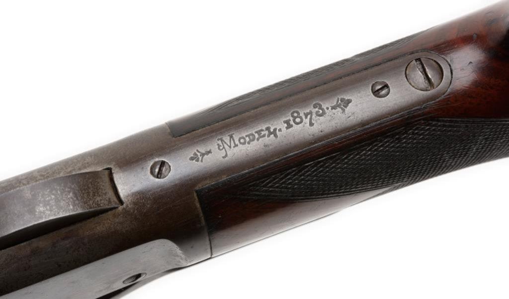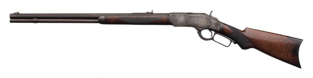 Deluxe Winchester Model 1873 lever action rifle, .38-40 caliber, 24” octagon barrel, S/N 432414, blued and case hardened finish, checkered wood deluxe stocks in overall very good to fine condition displaying a pleasing patina to barrel assembly with traces of original blue in protected areas; receiver shows a matching dark patina with traces of original case colors and silver tone. The action is crisp, the markings are sharp and the bore is near fine. The wood stocks show beautiful flame graining and the majority of their original finish; some scattered old mars and scratches from storage. Accompanied by an original factory letter confirming features and noted as received in warehouse on September 13, 1892 and shipped 2 days later to order number 5397. Est.: $4,500-$9,000.