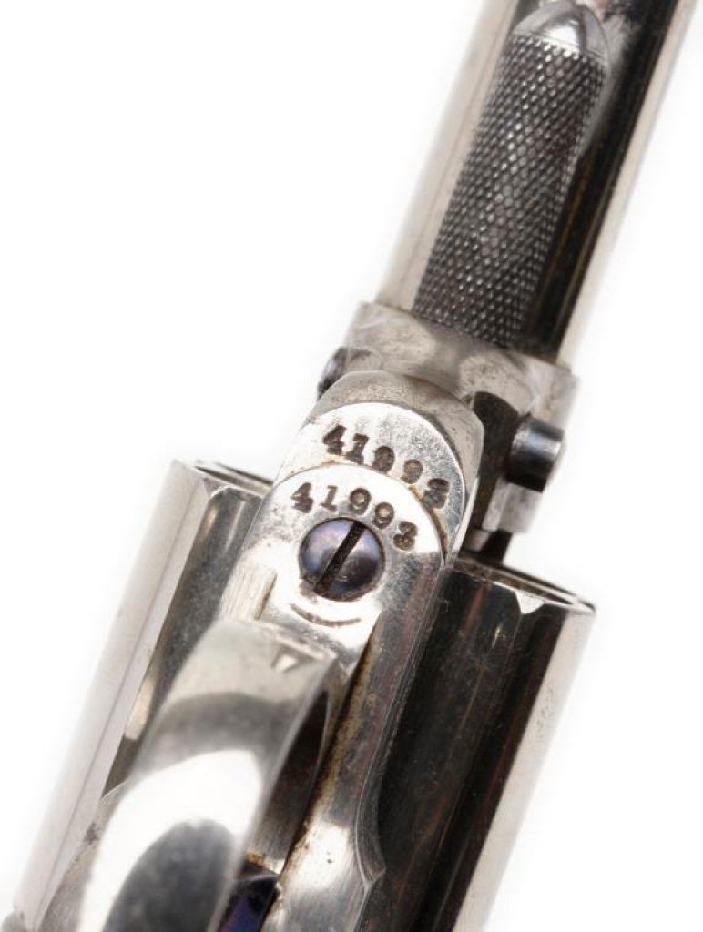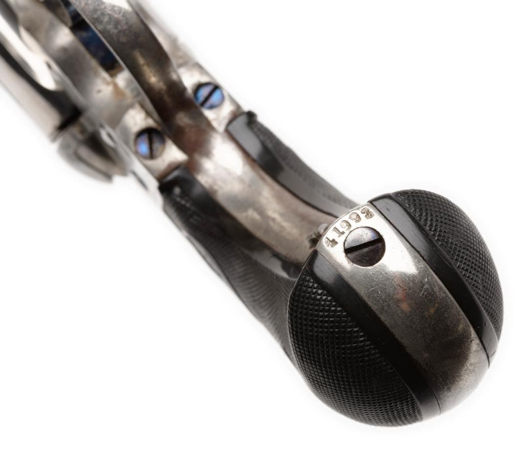 Colt Model 1877 DA “Lightning” revolver, .38 caliber, 3.5” etched panel barrel, S/N 41993, nickel finish, checkered black hard rubber grips in overall fine condition displaying the majority of its original nickel finish with its complete and sharp etching “COLT D.A. 38” on left side of the barrel; great original bright niter blue on trigger and hammer. The action is crisp, the markings are sharp, all matching visible numbers and overall very good to fine grips. Est.: $2,000-$3,000.