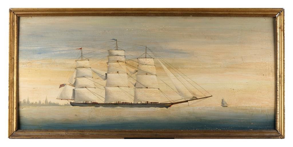 Oil on board of Clipper Ship flying the American Flag signed lower left S.R. Deiss, 1875 also (Sacanagy) probably town in Europe but spelling and letters not discernable. approx. 13"x30 1/2". Est: $4,000-8,000