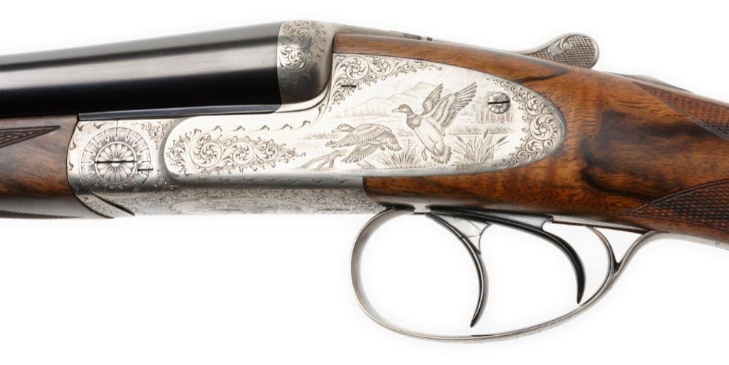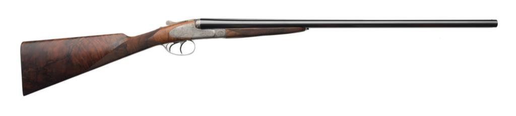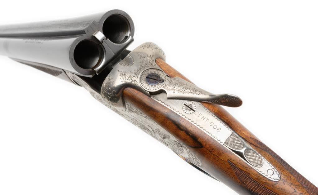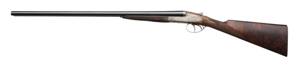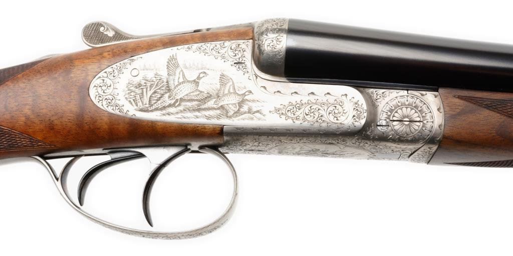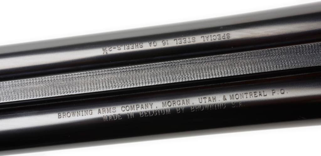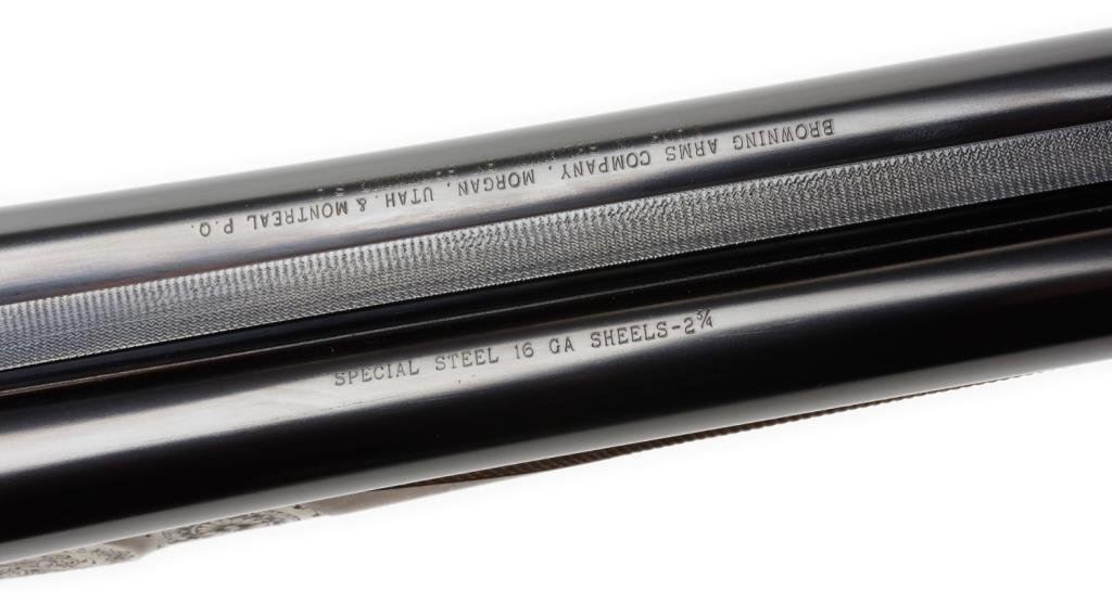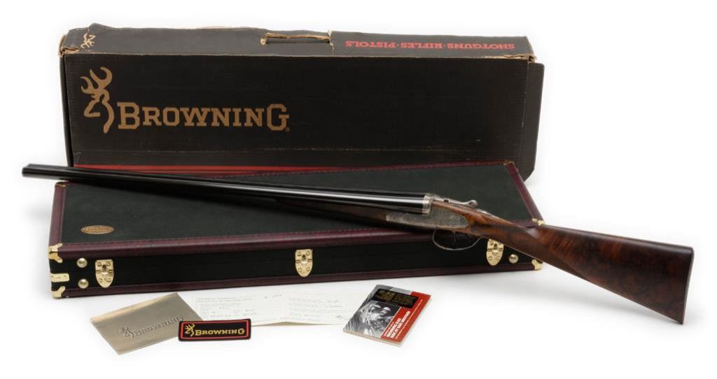 ++Special grade Belgian-made Browning SxS hammerless shotgun, 16 gauge, 27.5” barrels, S/N CENT-008, Anson type action made in collaboration with Lebeau-Courally to commemorate the 100th anniversary of the foundation of FN. Finely engraved in game scenes and signed “C. Baerten”, deluxe checkered walnut stocks with checkered butt. This beautiful shotgun remains in fine to near new condition showing no evidence of firing or use, 99% to new with all its original blue on the barrels and satin finish on the receiver. There is case hardening on the small parts and interior. The wood is excellent to near mint and shows a soft satin finish with beautiful graining. The gun is fitted with automatic ejectors and double triggers with a length of pull of approximately 15” from the front trigger to the end of the wood butt. Included is a Browning luggage case and original cardboard box. Accompanied by a letter on Browning stationary from Chip Hewlett, Customer Service Representative, dated July 30, 1996, indicating this 16 gauge was a Limited Series of an FN Anson with side plates and special 2.75” chambers and the maximum quantity produced throughout the world