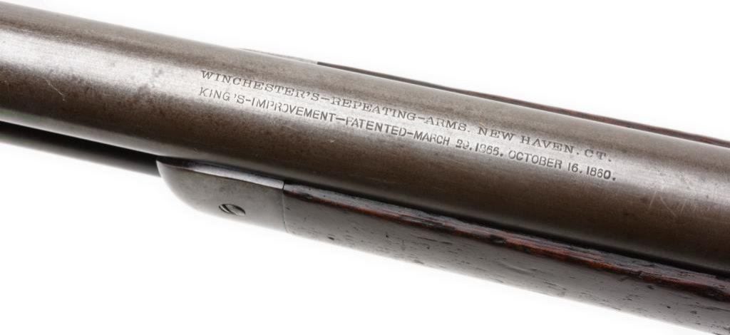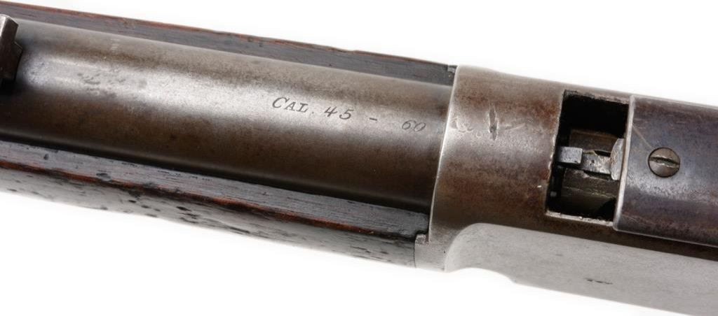 Winchester Model 1876 lever action rifle, .45-60 caliber, 28” round barrel, S/N 29589, blued finish, wood stocks in overall very good to near fine condition displaying areas of original blue on the receiver and original blue in protected areas of the barrel and loading tube with the balance of the gun gone to a pleasing patina; crisp action, sharp markings, very good to fine bore and good wood with scattered old dings, mars and scratches from carry and storage. Original factory letter confirms features and notes received in warehouse on November 3, 1882 with shipment on August 18, 1882 to order number 6003 with 8 Model 1876’s and returned by American Powder Mills with other 8 guns; this gun then reshipped on August 1, 1884 to order #13753. American Powder Mills was originally founded by Nathan Pratt in 1835 in Massachusetts; he subsequently sold his powder firm to the American Powder Co. in 1864 which later formed the U.S. Powder Trade Assn. in 1872 with all the big companies (DuPont, Hazard, Laflin & Rand, etc.). In 1883 the company re-organized as American Powder Mills and located itself in Boston, MA. One can surmise this ’76 and the 8 others were