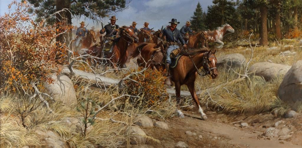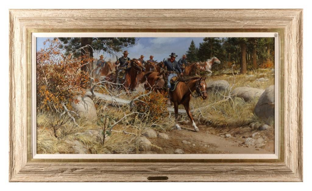 Framed original oil on canvas by noted artist Russ Vickers (1923-1997) entitled “Contact with the Renegades”, approximately 20” x 40” of picture and approximately 30” x 49” overall with frame. Russ Vickers was born in Paris, TX, the son of a horse trader. He served this country as a U.S. Marine during WW II and later in the Korean War, he was a combat artist. After the War, he worked as a technical illustrator. He began showing his paintings in the early 1970’s and those offerings are still highly valued by today’s Western collectors. Several of his paintings were used in the opening and closing credits of John Wayne’s Movie “Chisum”. Est.: $10,000-$15,000.