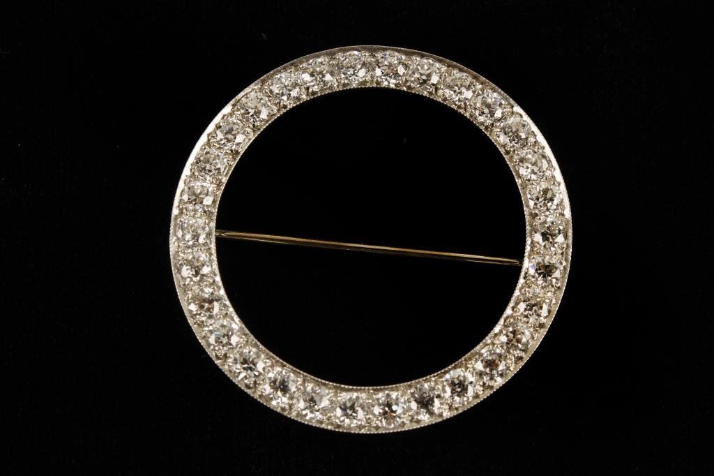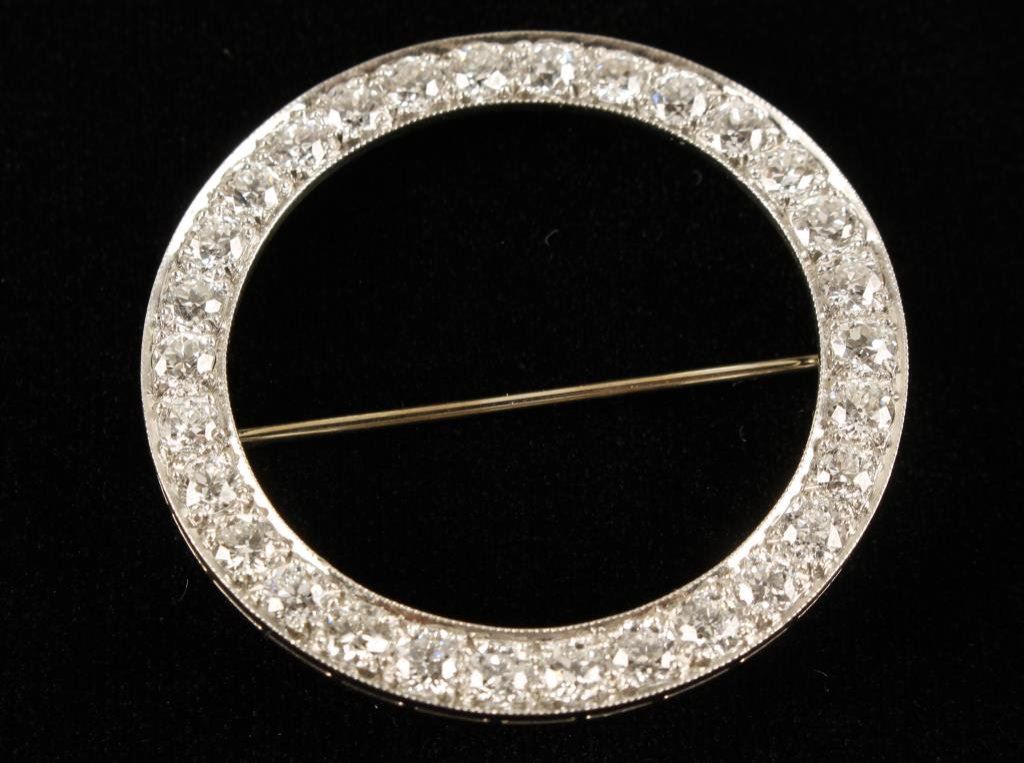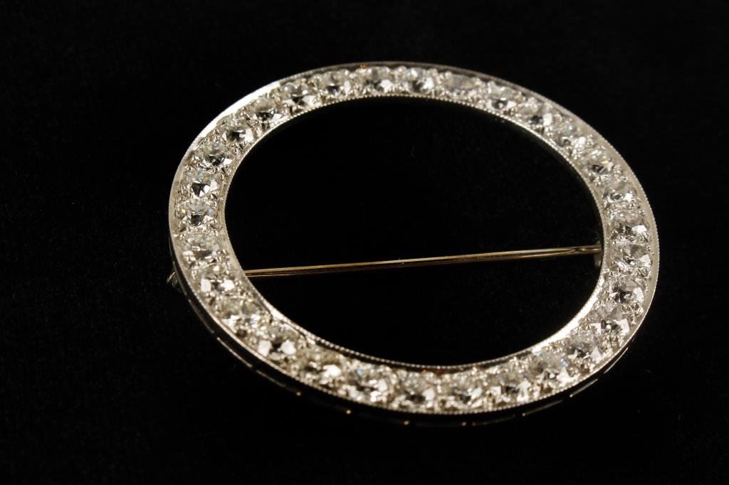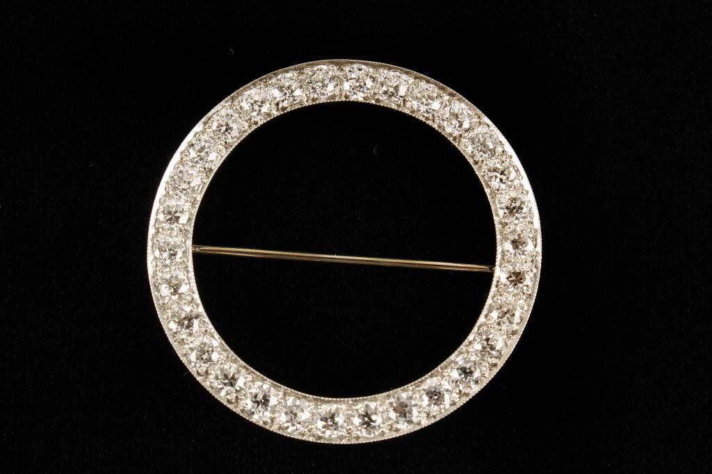 Art deco broach set with matched European cut diamonds in platinum with 4.94 carat total est. weight of stones. G to H colors. Retail replacement appraisal included at $14,229. Est.: $5000-$10,000