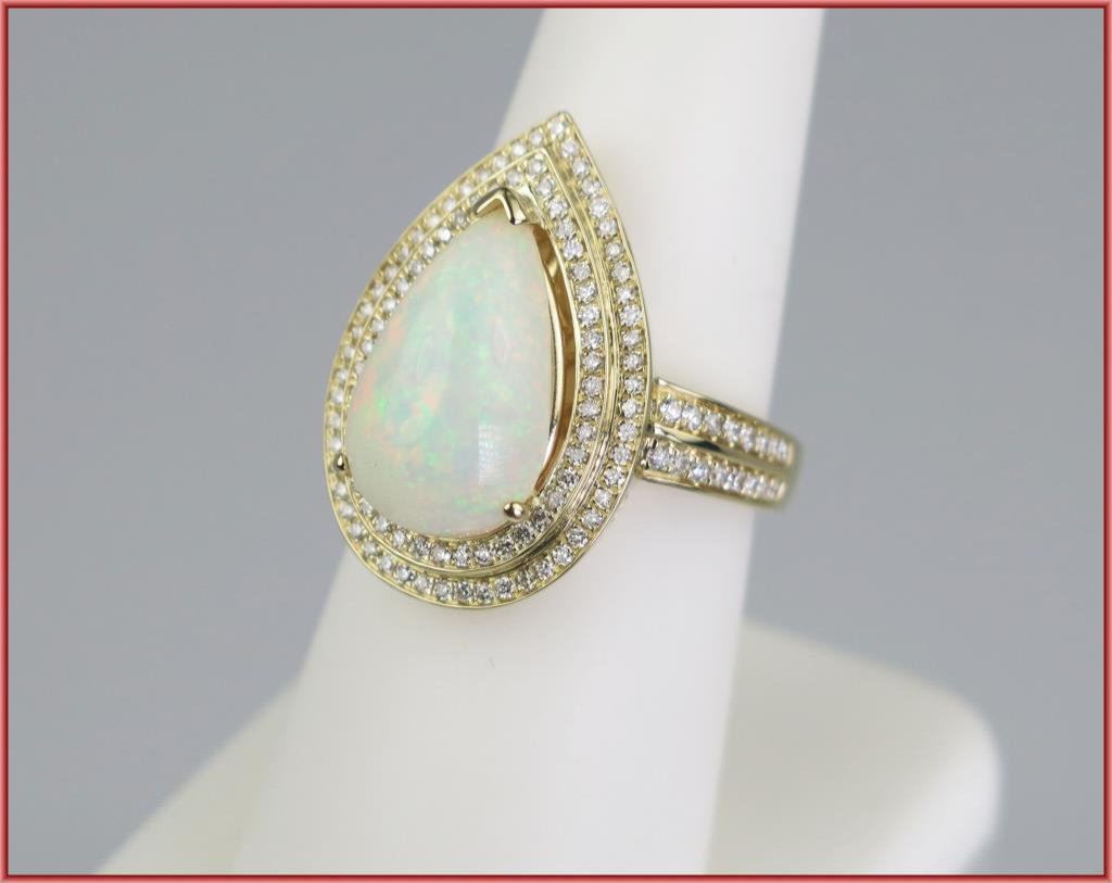 Show Stopping Gorgeous Pear Shaped Opal and Diamond Ring featuring a 3.65 carat spectacular FINE opal with intense full spectrum color flashes of red, orange, green and blue set in double halo setting of 130 Fine cut round Diamonds weighing approx. 2.00 carats with G-H colors and VS/SI clarity set in 14 karat yellow gold. NEW High Quality Collectors Piece. Retail $7,000-$8,000 Estimate $3,600-$4,000