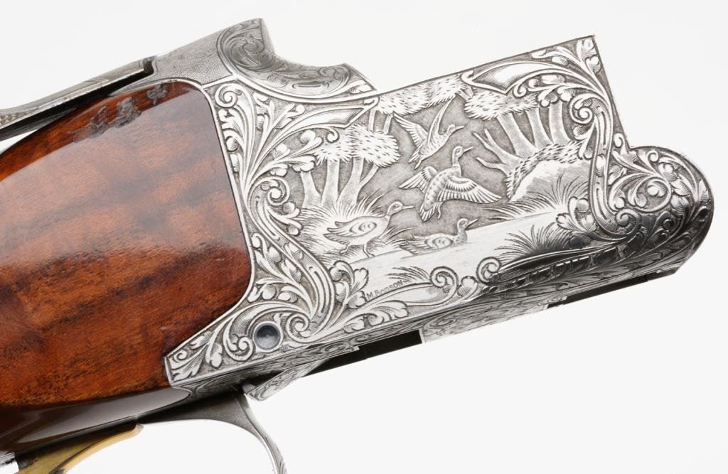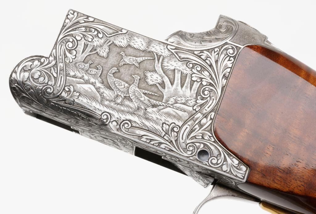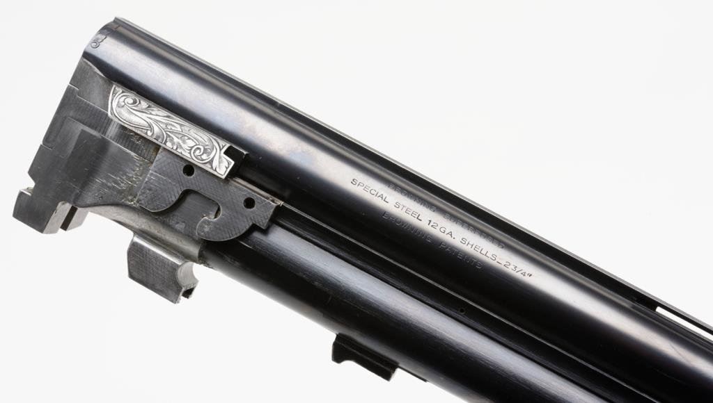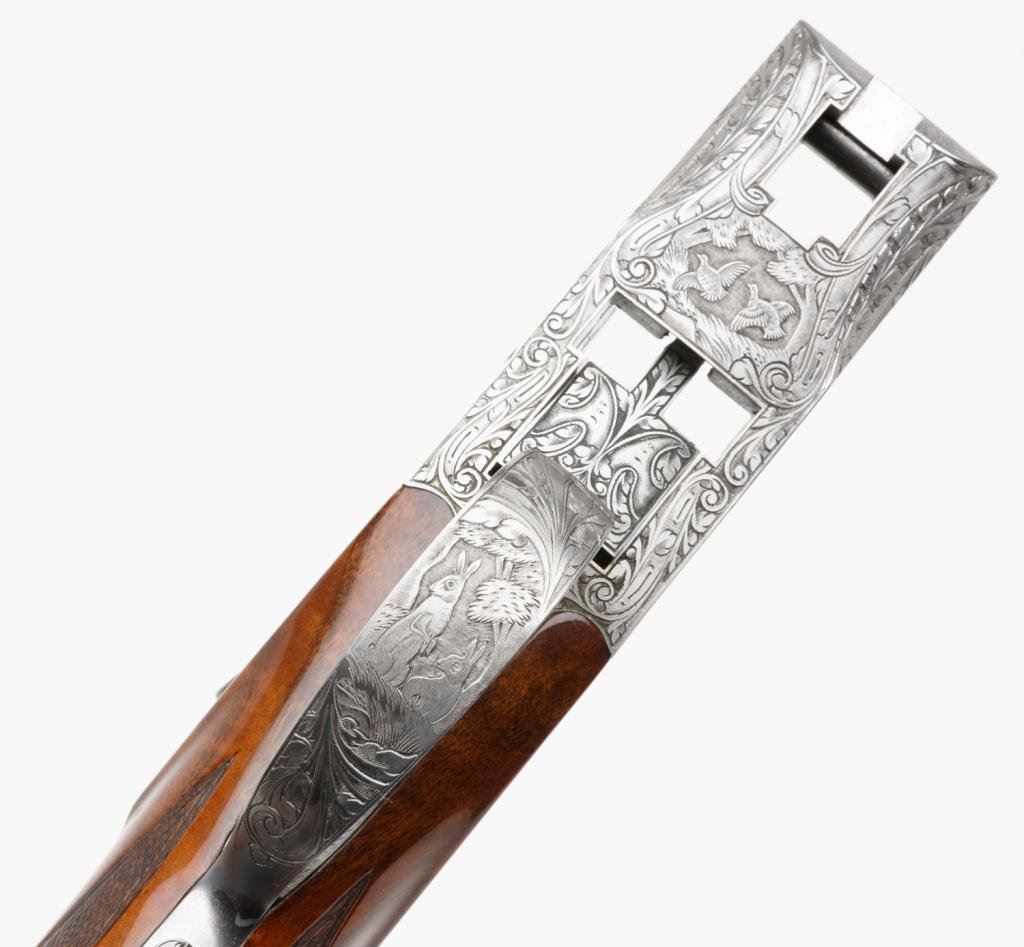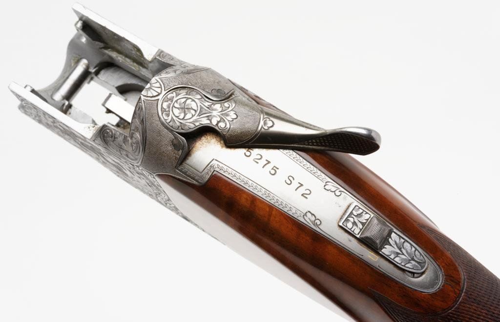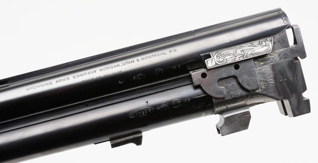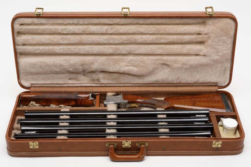 Browning Diana Factory 4 Barrel Skeet set in 12, 20, 28 and 410, #5275s72. All barrels are ensuite engraved and matching. Signed by engraver M. Bodson. 13 5/8" to end of wood, 14 5/8" to end of pad. Very good plus to near fine condition. Approx. 90-95% overall. In original Browning luggage case. A desirable and scarse factory set. Est: $6,000-12,000