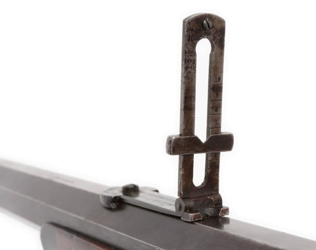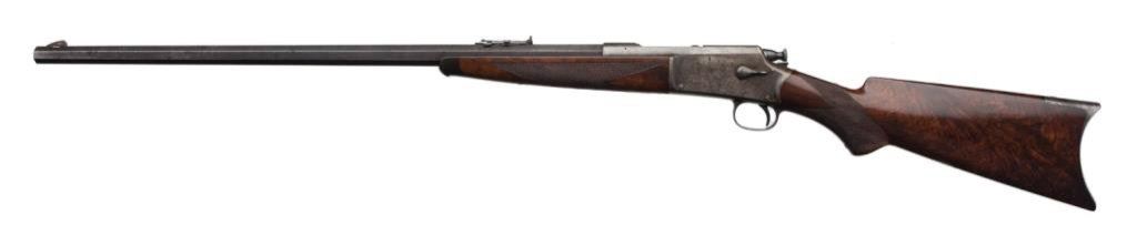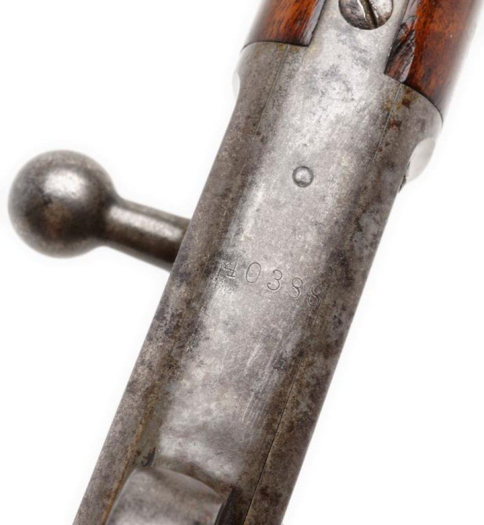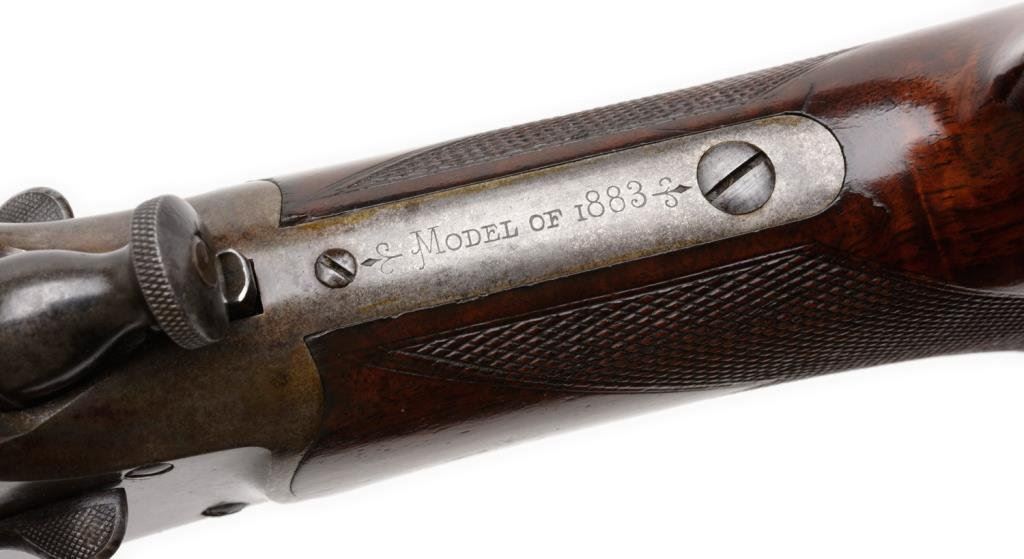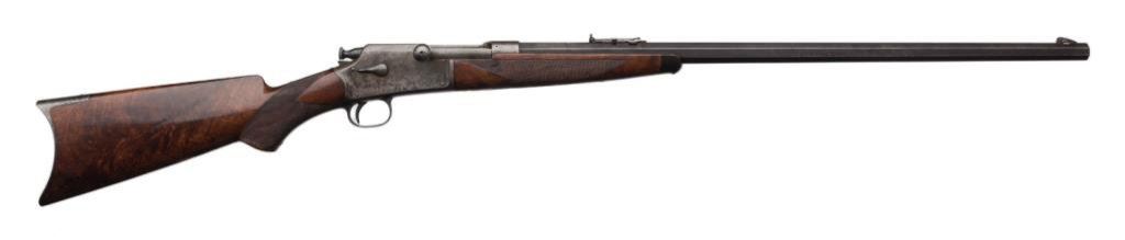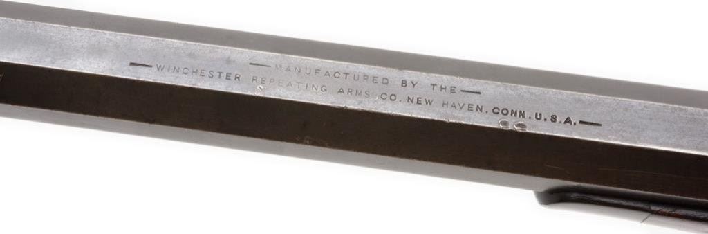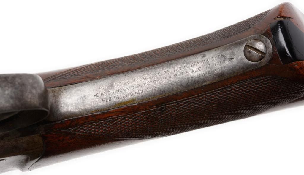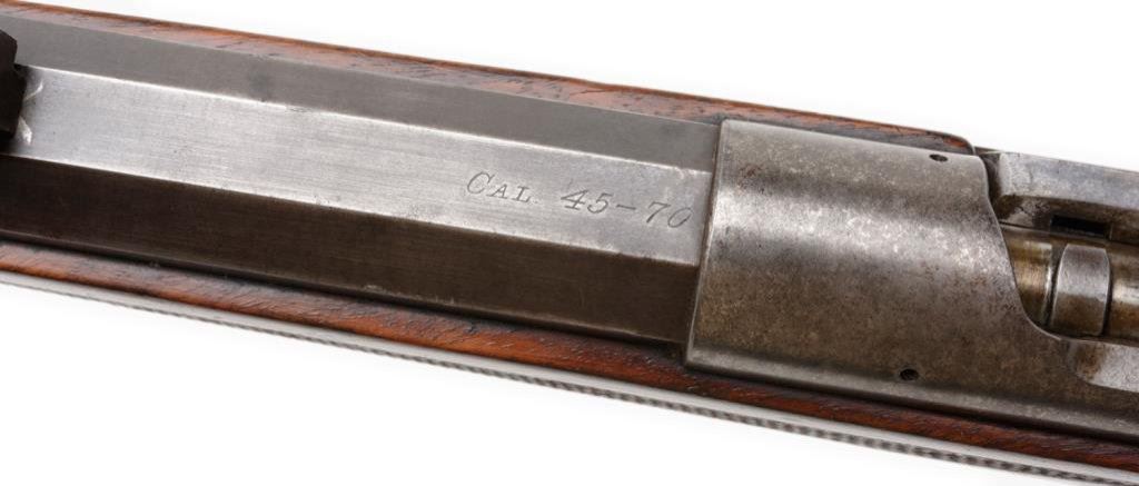 Winchester Hotchkiss bolt action rifle, 45-70 caliber, serial #40388. The rifle is in overall very good to nearly fine condition with a 26” blued octagonal barrel, case colored receiver, knife blade front and elevator rear sight sights. The barrel retains 60-70% of its original blue finish with some light surface rust and scratches evident. The receiver still shows small amounts of case color in the protected areas with the balance having become a silver tone. The tang is marked “Model of 1883”. The finely checkered deluxe wood stocks are in overall very good condition showing slight mars, compressions and flattening of checkering. Further evidence of the deluxe stocking is present in the ebony tip on the fore end and ebony inlay of the pistol grip. The wood has beautiful feather crotch figure in the buttstock, a blank silver escutcheon plate and a smooth, metal crescent butt plate. The bore is very good, the action crisp and markings sharp on this rare and impressive rifle. A consignor provided letter indicates the rifle left the factory on May 24, 1886. Est.: $6,000-$12,000.