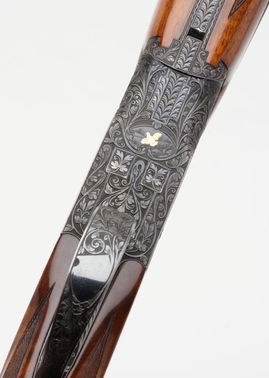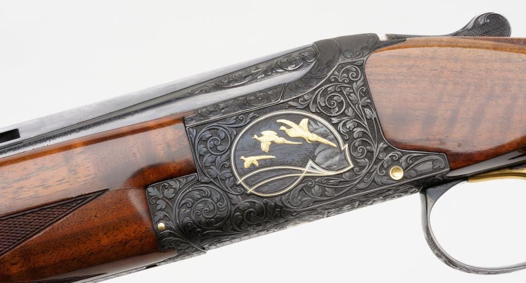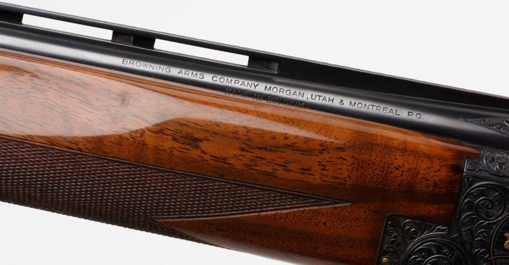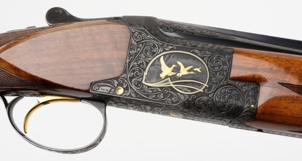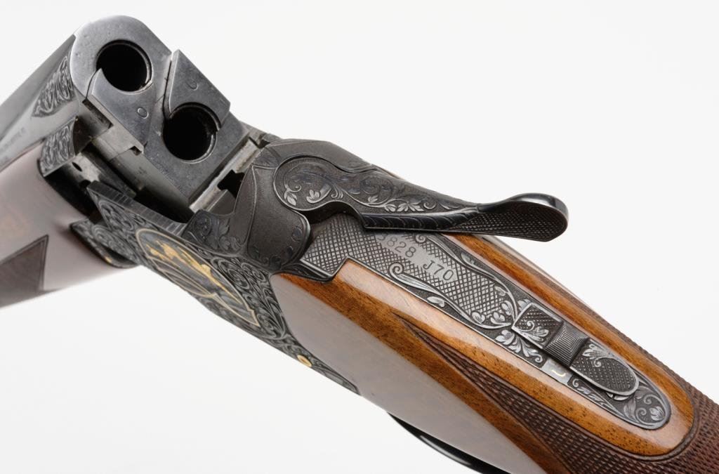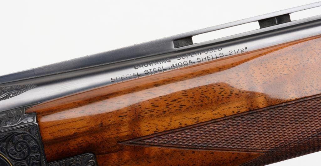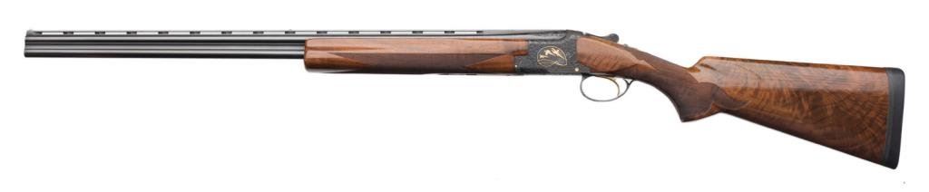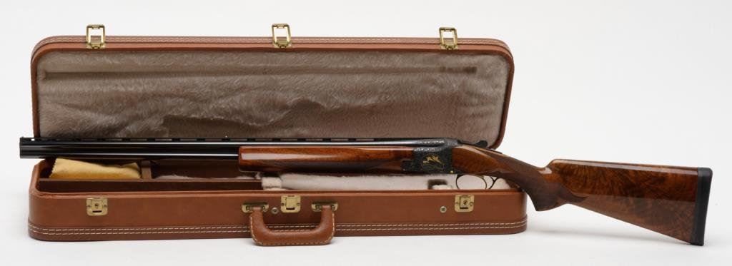 Browning Midas 410 gauge O/U shotgun with 28" barrels, choked skeet and skeet, #3828j70. 13 1/2" to end of wood, 14 1/4" to end of recoil pad. Signed Vandesmisseng and M.H. Near fine condition with minor blue loss on gripping area and edges. 9--95% overall. Very desirable. Est: $7,000-14,000