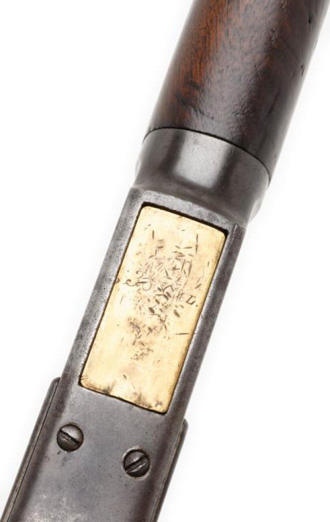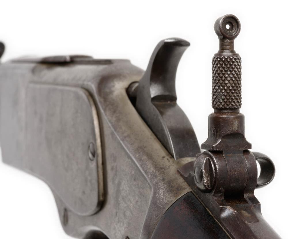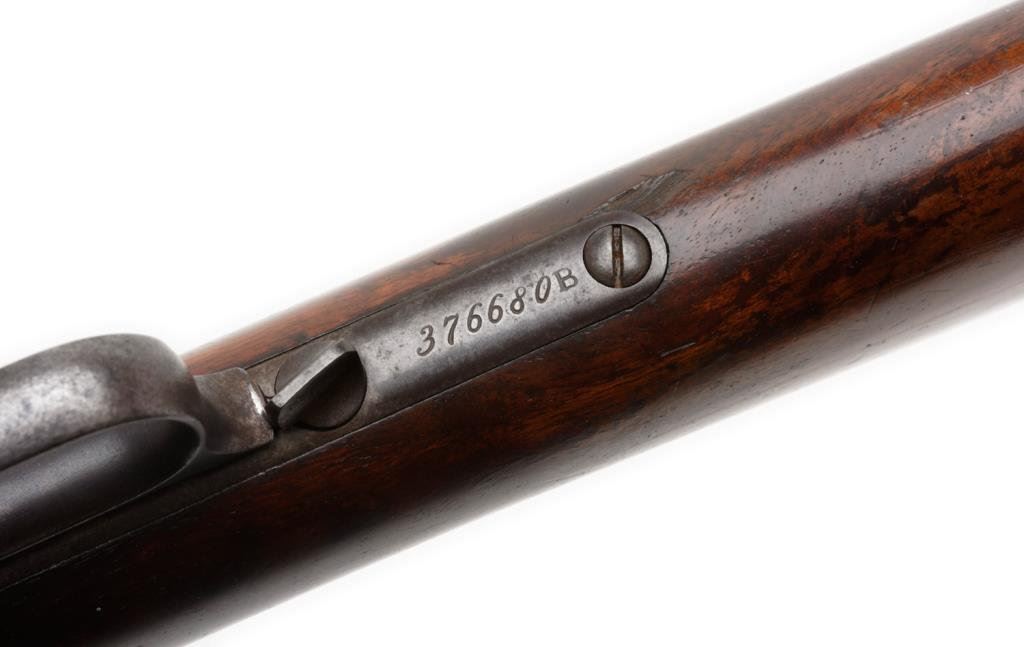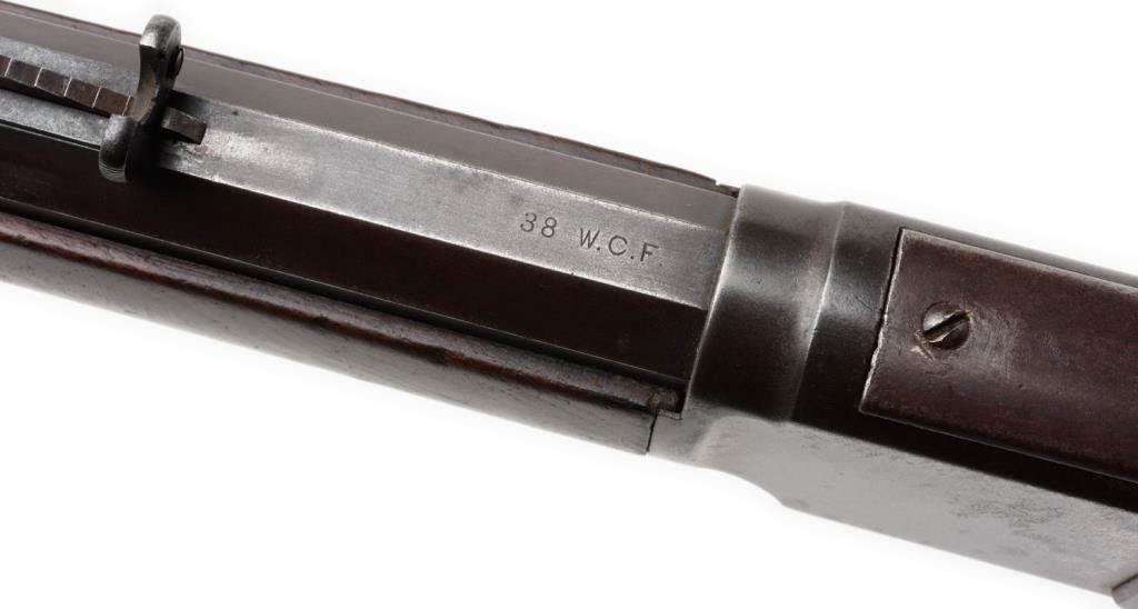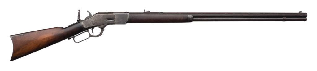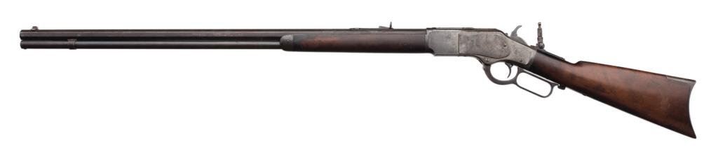 Special order Winchester Model 1873 lever action rifle, .38-40 caliber, 30” octagon barrel, S/N 376680B, blued and case hardened finish, set trigger (not working at time of description), adjustable flip-up tang sight, wood stocks. This gun is in overall very good to near fine condition displaying a brown patina to barrel and loading tube with traces of original blue in protected areas; traces of original case colors on the receiver, hammer and lever with areas of silver tone on the receiver. The bore is very good +, the action and markings are crisp and the wood is very good with some scattered mars from storage and some oil staining at the wrist area of the butt stock. Est.: $3,000-$6,000.