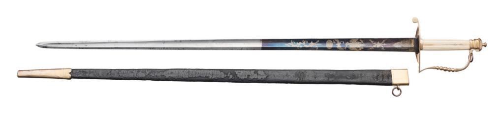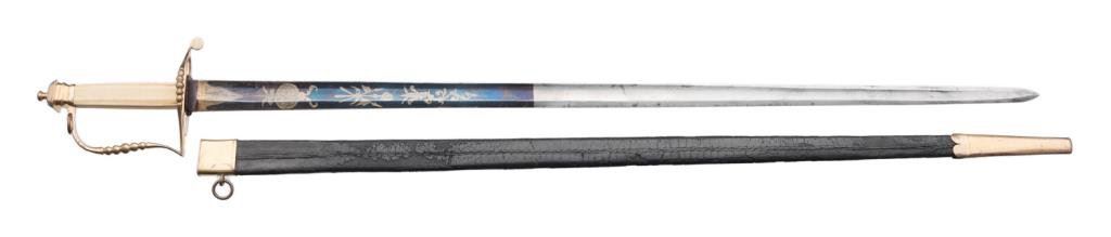 American Federal period pillow hilt sword with leather scabbard. The sword is approximately 37.75” overall with a 32” blade that is decorated with gold patriotic and floral designs on both sides and niter blue finish extending approximately 13” toward the point of the blade from the base. The sword’s mounts are gold washed and the grip is of bone. The leather scabbard has a gold washed throat and tip. This beautiful early sword is in overall very good to fine condition showing the majority of its original niter blue finish. It’s design work also maintains the majority of its gold finish. The front half of the blade retains the majority of its original polish with some scattered slight spots of erosion. The scabbard is good overall with considerable flaking of the top layer of leather; seam stitching remains tight. Est.: $2,000-$3,000.