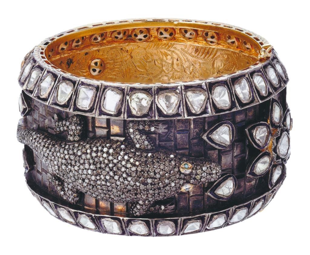 Magnificent and unique antique bangle bracelet mounted with 84 large rose cut diamonds of approximately .40 each for a total of 34.5 CTs along with alligators studded with diamonds of 5.50 CT. Total weight professionally estimated at over 40 CTs of diamonds in beautifully crafted sterling silver. The type of bracelet you would have seen on stars in the golden age of film pre WWII. Estimated replacement $100,000-$150,000 at todays rate. Est.: $15,000-$30,000