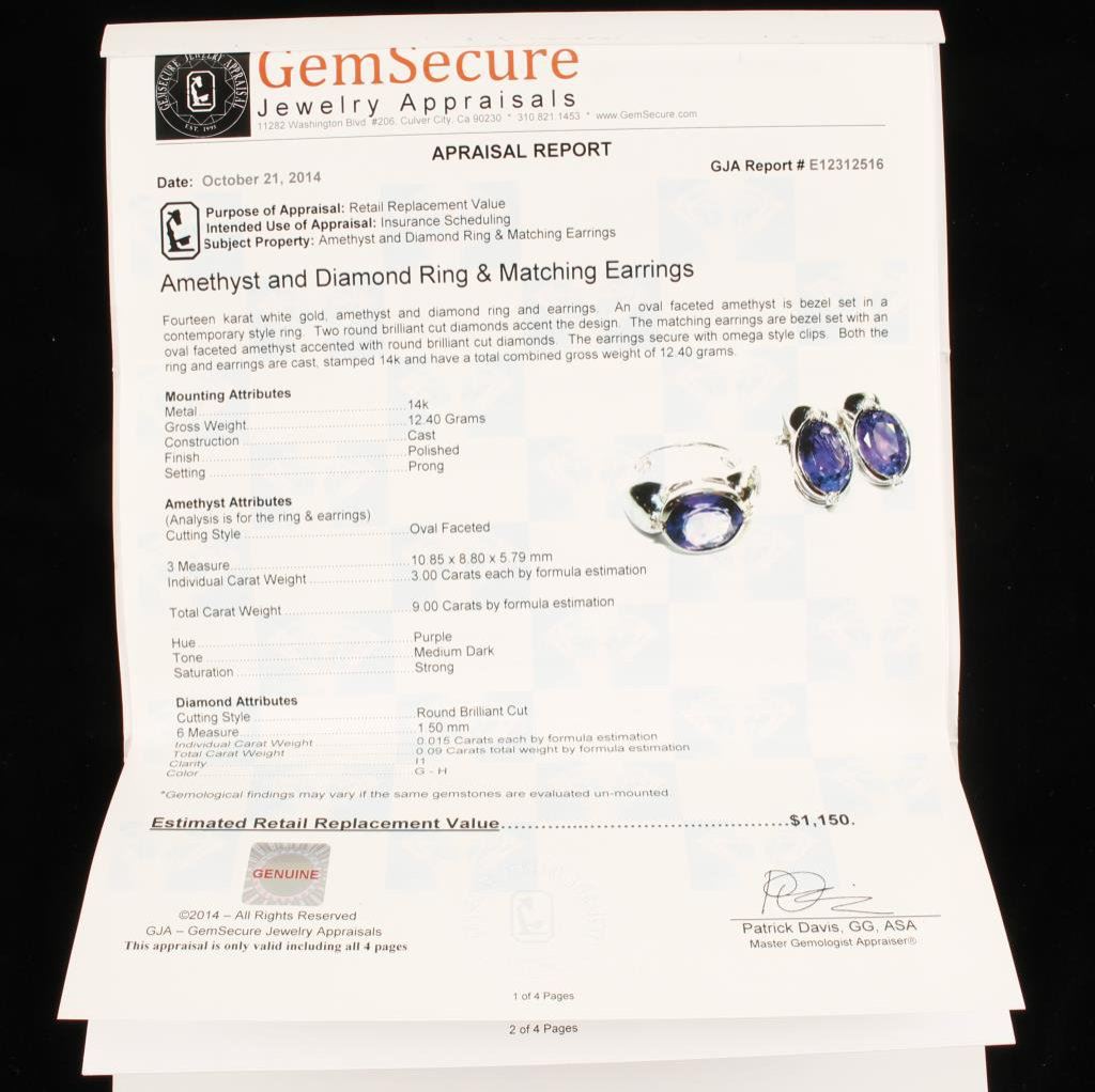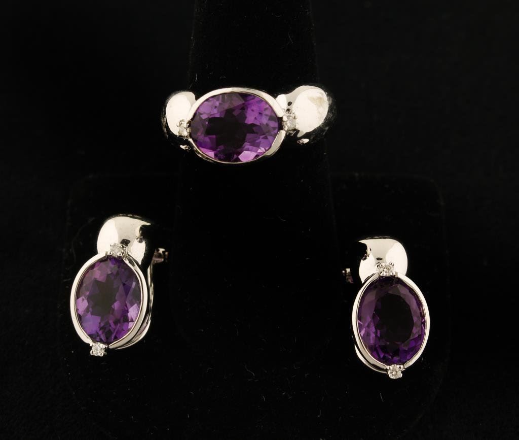 One modern design amethyst and diamond ring and earring set made in 14 k white gold oval amethysts weighing 9ct Est. Retail Value $900-1200