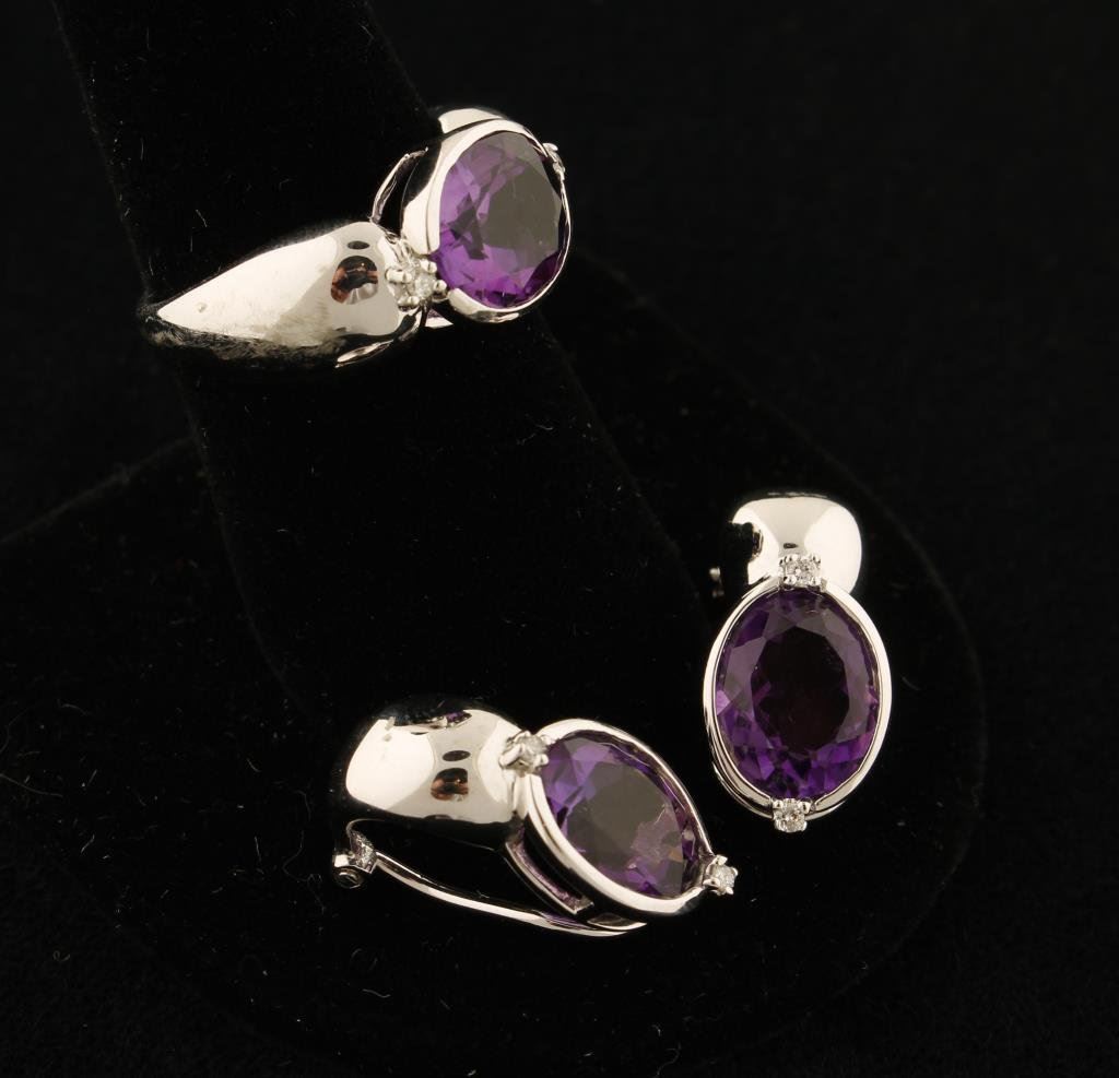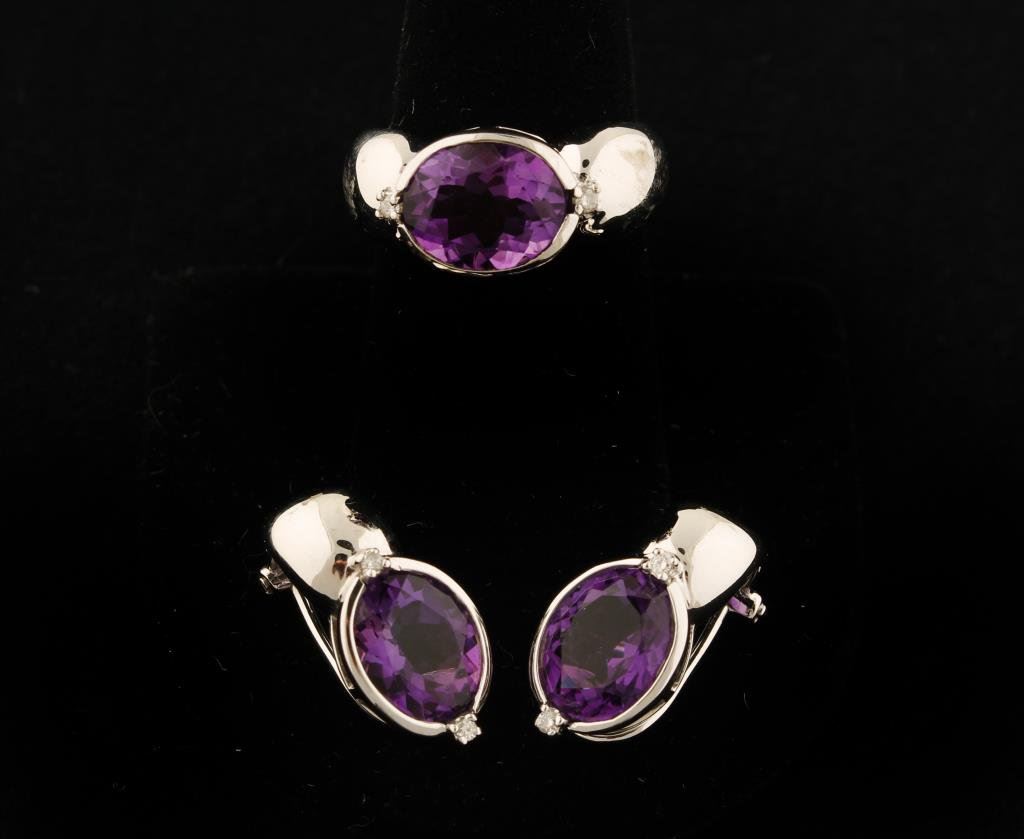 Lot 247 One modern design amethyst and diamond ring and earring set made in 14 k w