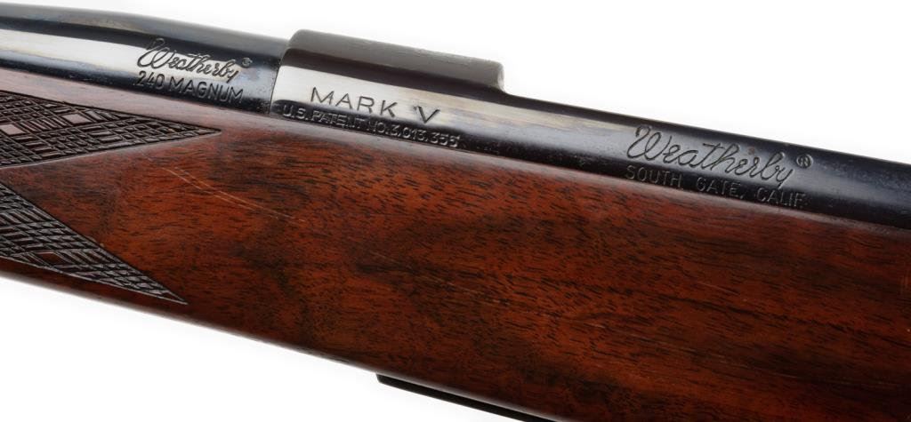 Weatherby MKV in .240 magnum with South Gate, CA address shows made in West Germany on the BBL, SN: P443884 with a 24” BBL. In fine to excellent condition and high quality checkering. Est.: $900-$1800