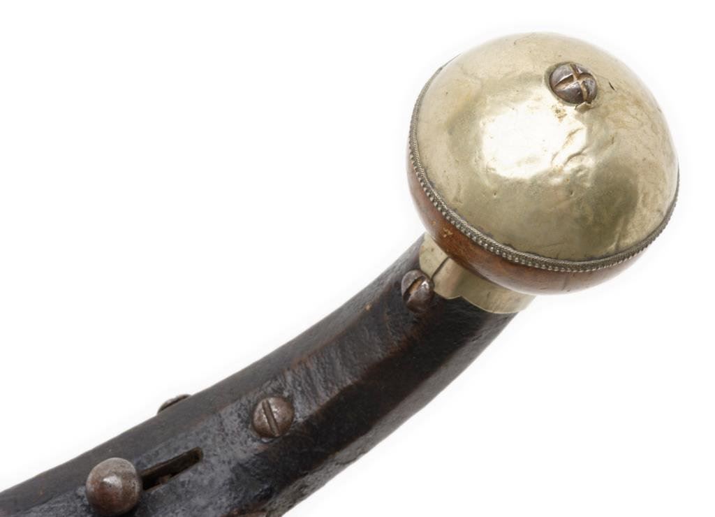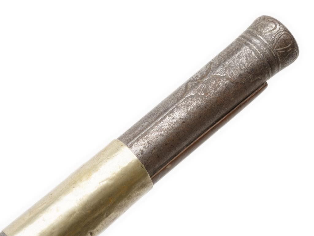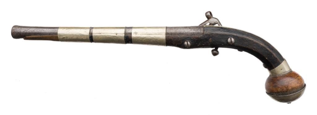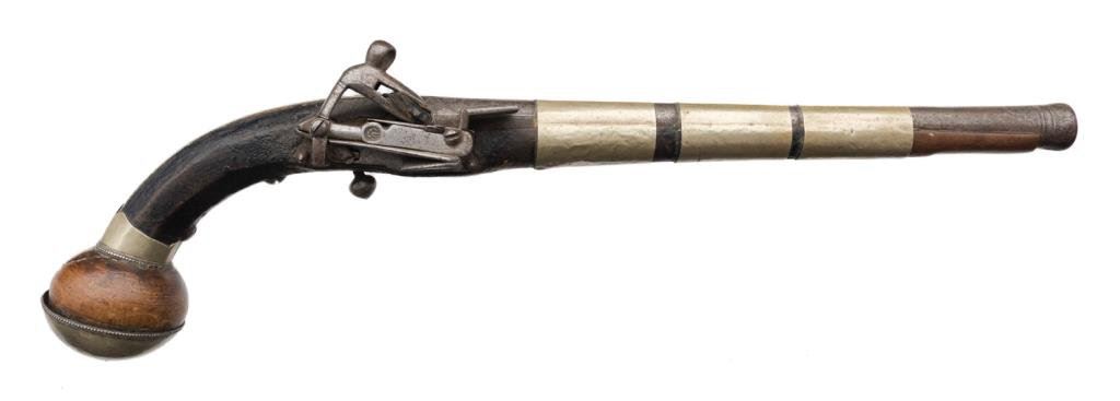 Caucasian Miguelet pistol, well-marked, approximately 16.5” overall with a 10.5 damascus barrel, three metal barrel retainers and leather wrapped wood stock; classic wood “bulb” butt with metal butt cap; overall good to very good condition with functioning action, dark patina to metal surfaces and considerable leather wrap remaining on the frame portion of the stock. Est.: $600-$1,200.
