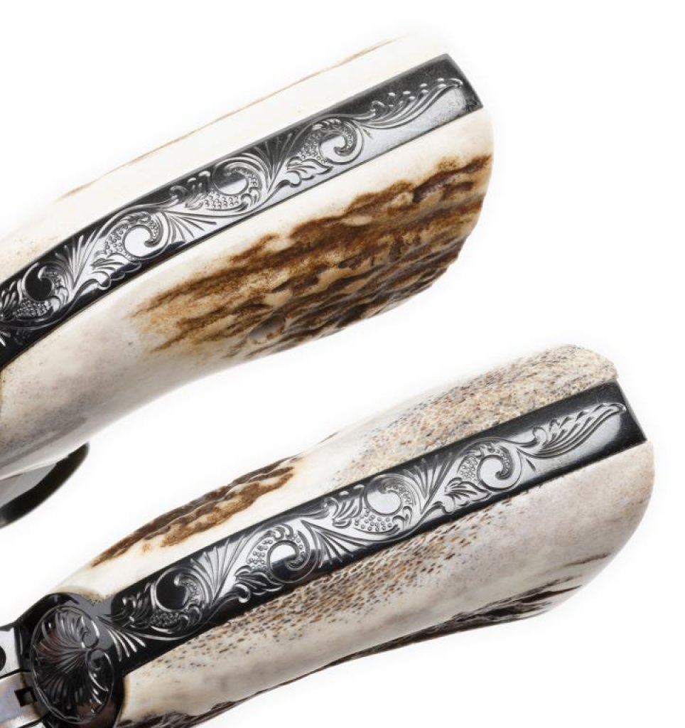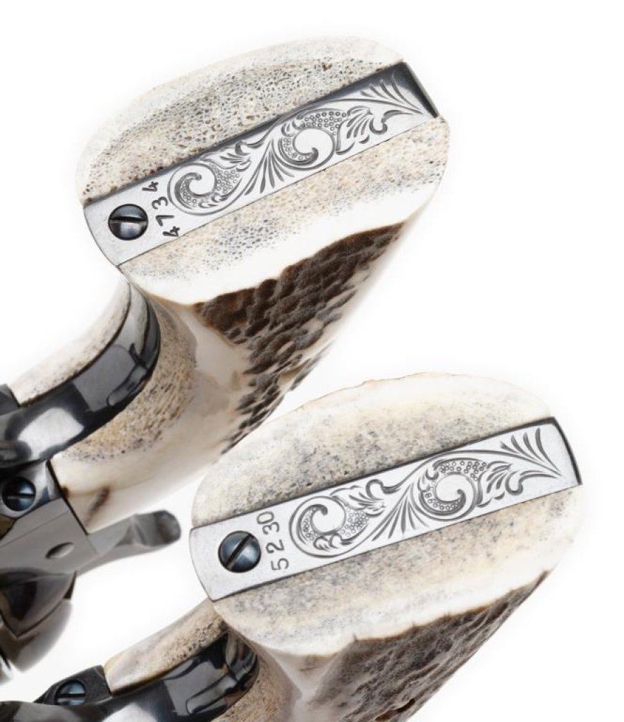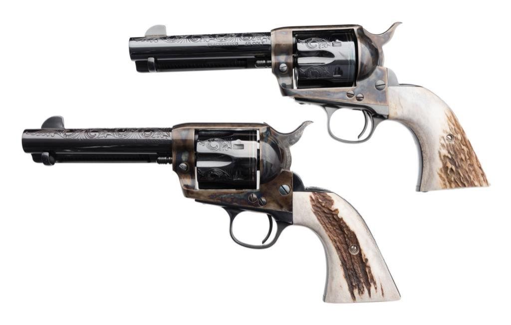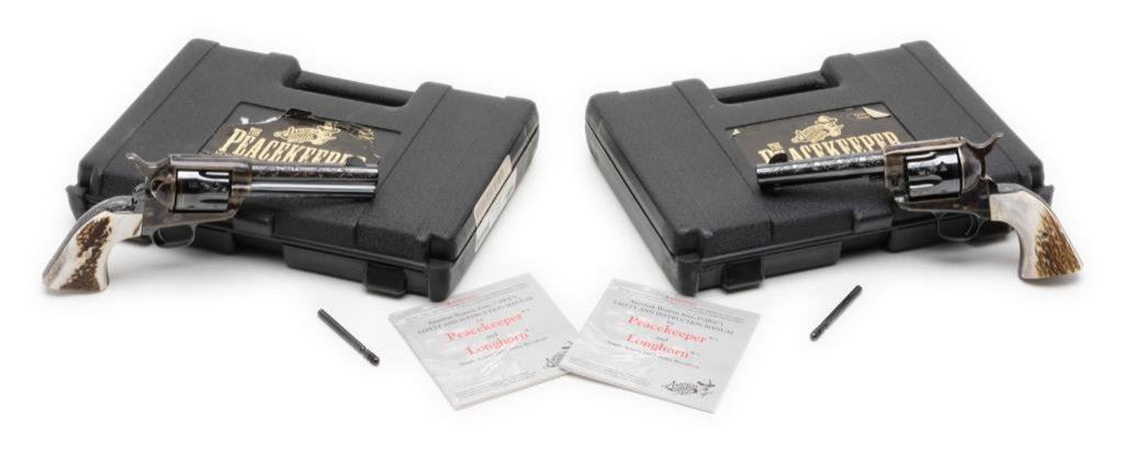 **Pair of engraved American Western Arms (“AWA”) Peacekeeper Model SAA revolvers, both in .45 Colt caliber and both with 4.75” barrels, S/Ns P4734 and P5230; both also with blued and case hardened finishes with silver banding on the back end of each cylinder and elk horn grips mounted to each revolver. Both guns are accompanied by padded plastic hard carry cases and Instructional manuals. These beautiful guns are in like new condition as customized, polished, honed, tuned and refitted. The company only produced this Model for several years as Colt Firearms won an infringement lawsuit against them causing the Peacekeeper to be dropped from production. Accompanied by a color photo of #P5230 and Certificate by Downing. Est.: $2.500-$5,000.