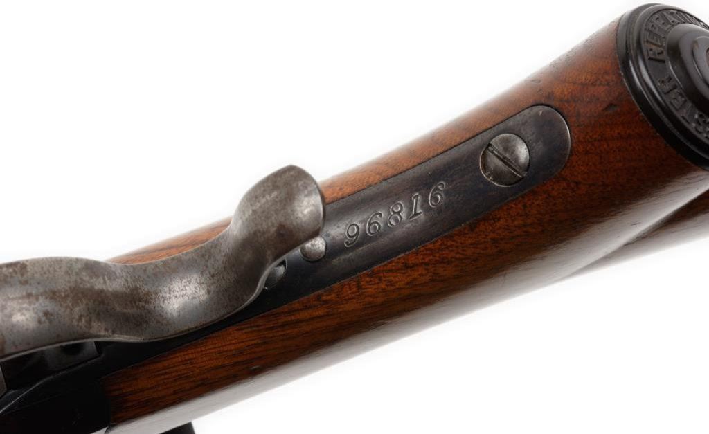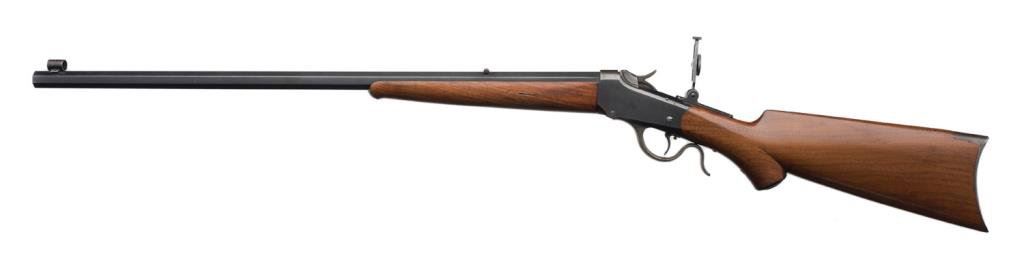 Winchester Model 1885 “low wall” single shot target rifle, .22 W.R.F. caliber, 26” octagon barrel, S/N 96816, blued finish, adjustable tang peep sight, spirit level in rear dovetail and hooded front sight; set trigger (working at time of description) with pistol grip wood butt stock and matching wood forend with ebony front insert. This beautiful Winchester is in overall fine condition showing the majority of its original finish, fine bore, crisp action, sharp markings and fine wood. Est.: $2,000-$3,000.