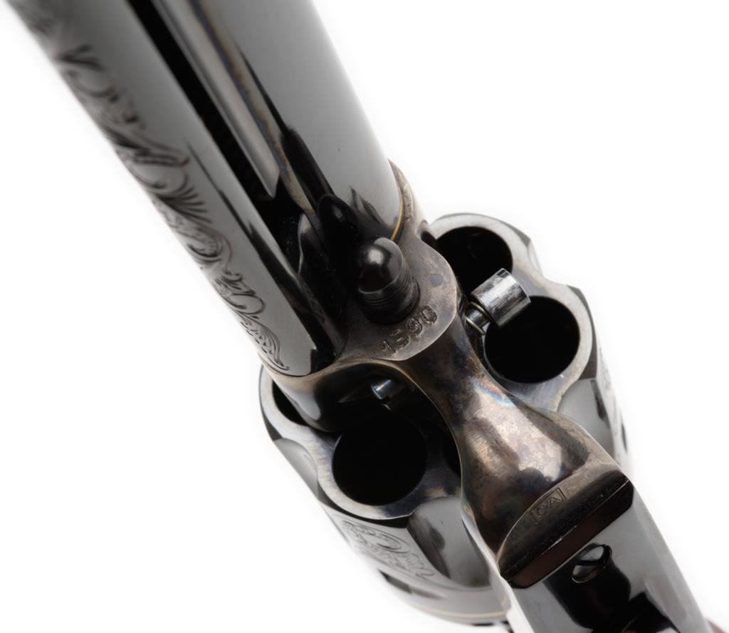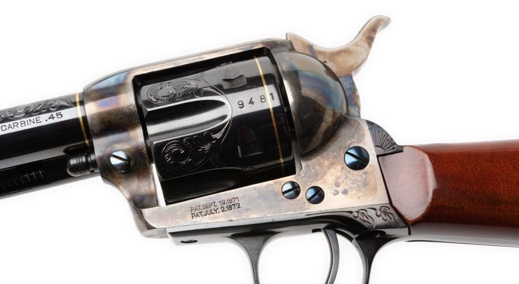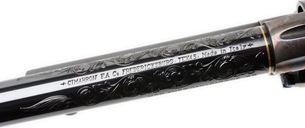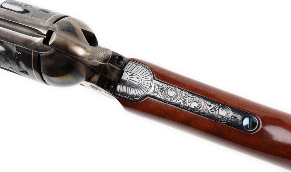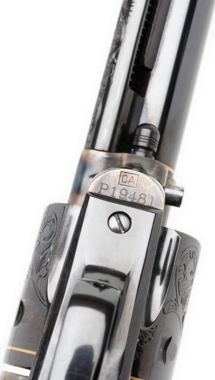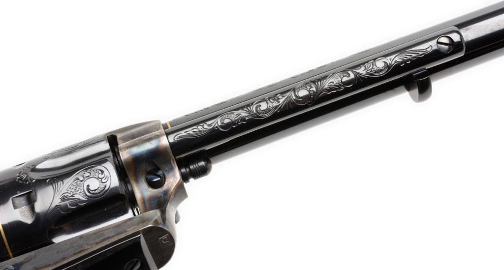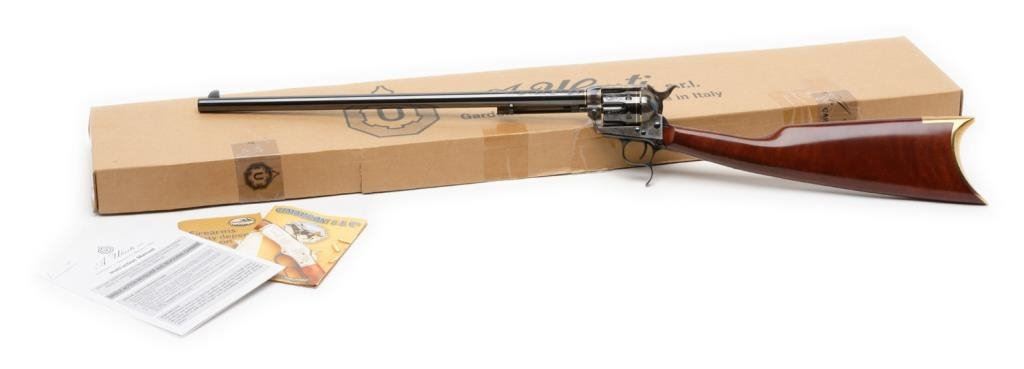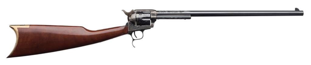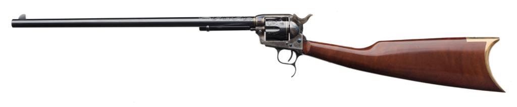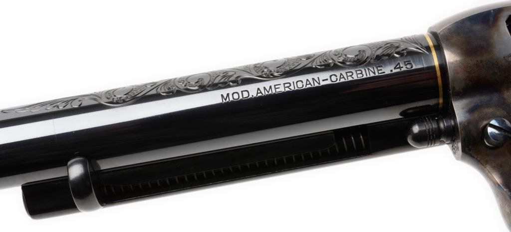 **Uberti/Cimarron modern “American Carbine” Model copy of a modified Colt SAA revolver with integral wood butt stock, .45 caliber, 18” barrel, S/N P19481, custom engraved and gold banded by Jim Downing, blued and case hardened finish, smooth wood butt stock. Accompanied by factory cardboard box and instructions manual. This gun is in like new condition as customized and shows little handling; consignor states gun has been custom polished, honed, tuned and fitted. One-of-a-kind! Est.: $1,500-$3,000.