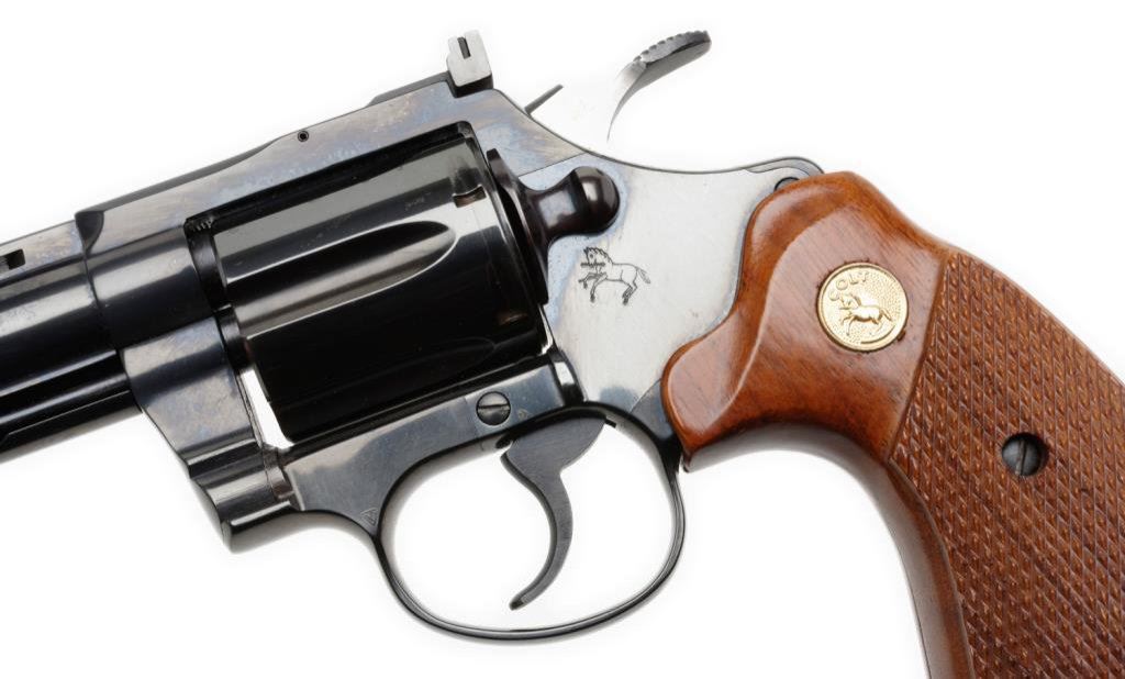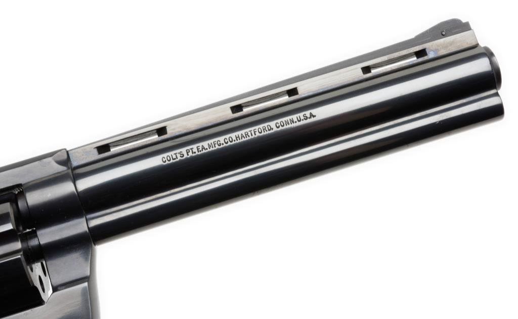 ++Colt Diamondback Model DA revolver, .22LR caliber, 6” ventilated rib barrel, S/N R56953, blued finish, checkered wood medallion combat grips with instructions, factory wood grained cardboard box and Styrofoam inserts. This gun is in like new condition showing little handling. The box end label is numbered to this gun; scattered scuffing and tears to box with end label present but separated. Est.: $600-$1,200.
