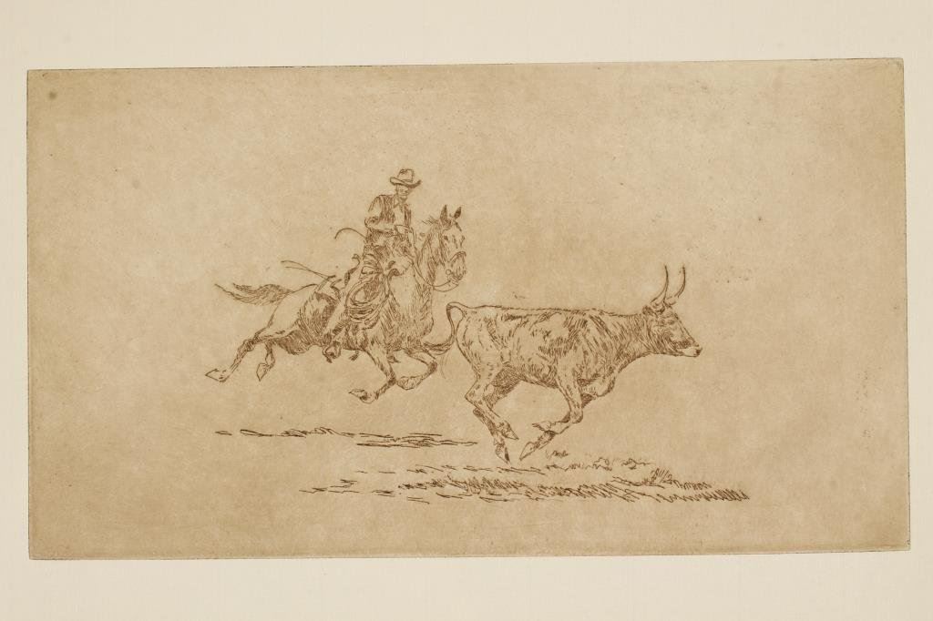 Posthumous Borein etching; type sold at Galleries in Santa Barbara, CA in the 1950’s to 1990’s; no signature, approximately 5” x 9” image size; subject matter is classic cowboy on horse chasing a longhorn steer. Ready for framing and matting of your choice! Est.: $100-$200.