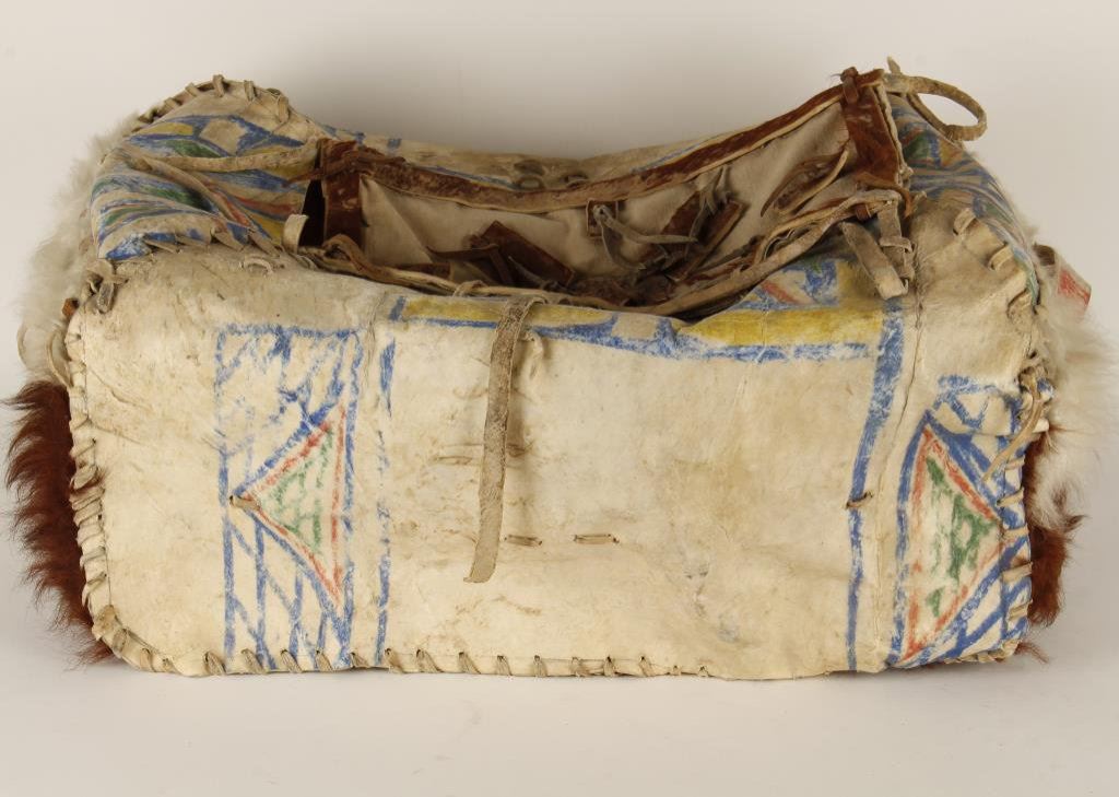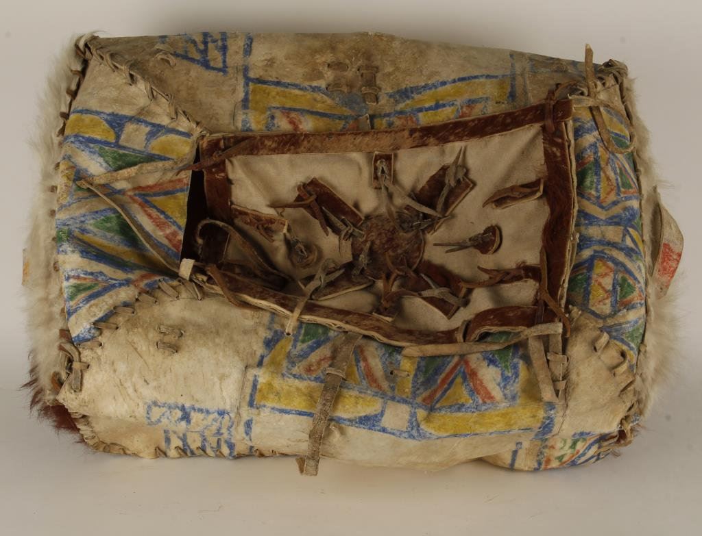 Old Indian-made thong laced and painted par flesh trunk approximately 23” long, 20” wide and 11” tall with canvas cover to trunk’s opening at top; in overall good to very good condition with cattle hide end pieces. Accompanied by three ring binder including an original newspaper article from the Billings, Montana Gazette, dated November 28, 1965, picturing the trunk and noting that the trunk “rests on a davenport in the Earl Grainger (1919-1995) living room. Once, the Graingers say, the trunk was used by Col. W.F. (Buffalo Bill) Cody when he took his Wild West show on tour”. The article further notes that Earl Grainger and his wife at the time of the article’s writing, were owners of the New Yellowstone Hotel and Antique Shop in Laurel, MT. Copies of other articles further describe the Graingers’ extensive collection of artifacts in a home “that could double for a Museum”. The article also mentions Earl served in the Army Air Corps during WW II. Est.: $800-$1,600.