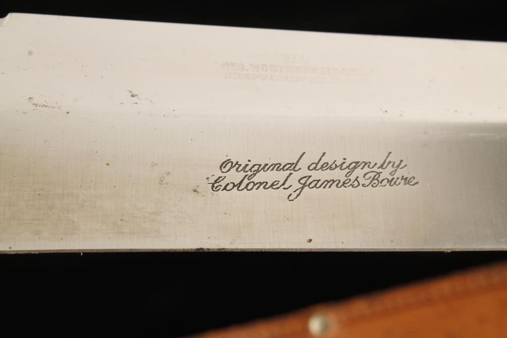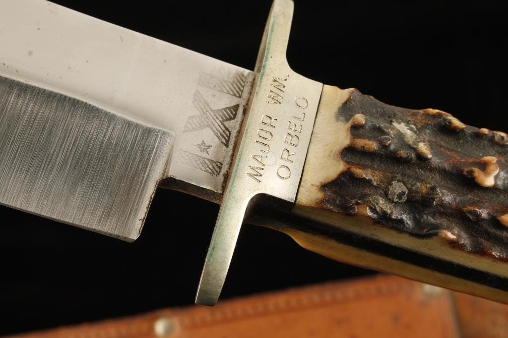 Large Modern Bowie knife, I*XL by Wostenholm & Son, Sheffield, England and marked “Original design by Colonel James Bowie”; also inscribed on cross guard “MAJOR WM. ORBELO”; approximately 15” overall with a 10” blade, thick stag grips and an I*XL marked leather sheath. The late Major Orbelo was a well-known gun collector in Texas and Veteran of the Vietnam War. Est.: $400-$800.