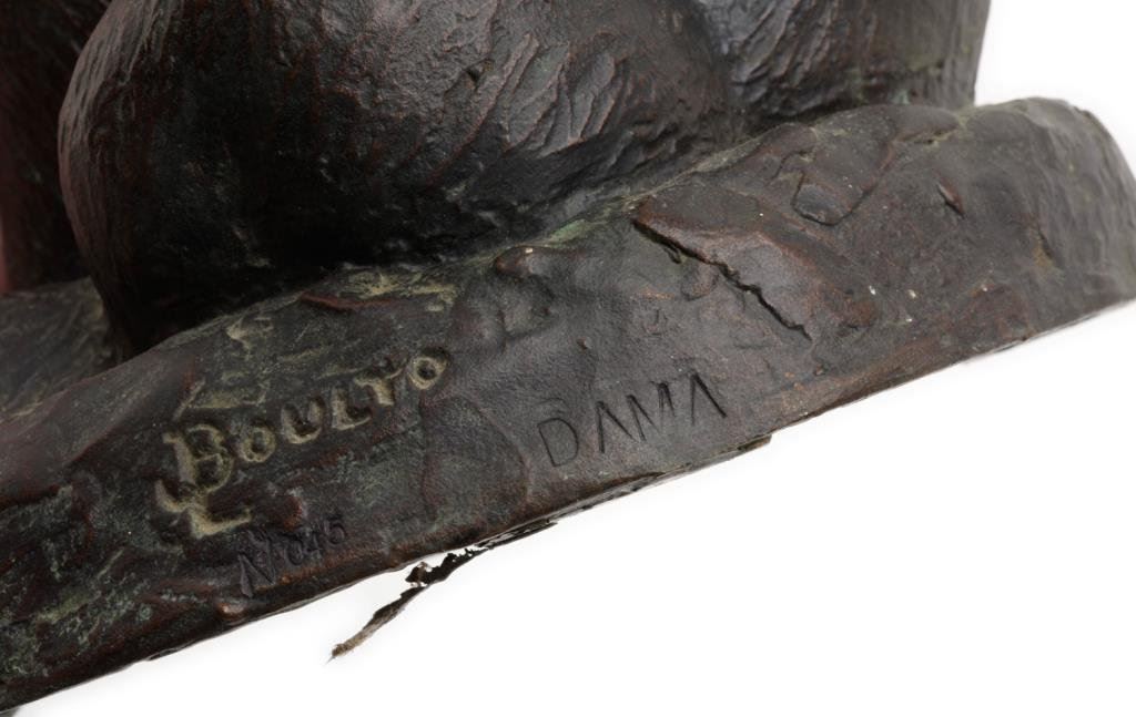 Original bronze entitled “The Alaskan Bear” by noted artist Joseph L. Boulton (1896-1981); fine patina, signed in base and foundry marked “DAMA” and “No. 45”; approximately 9” in height and 7” in diameter; finely accomplished. Est.: $500-$1,000.