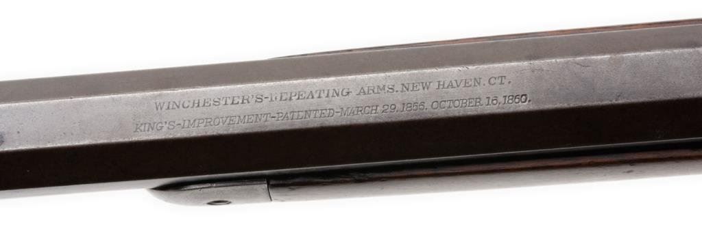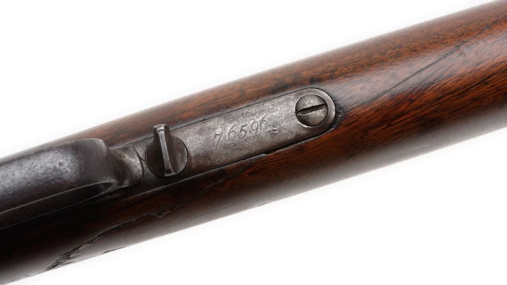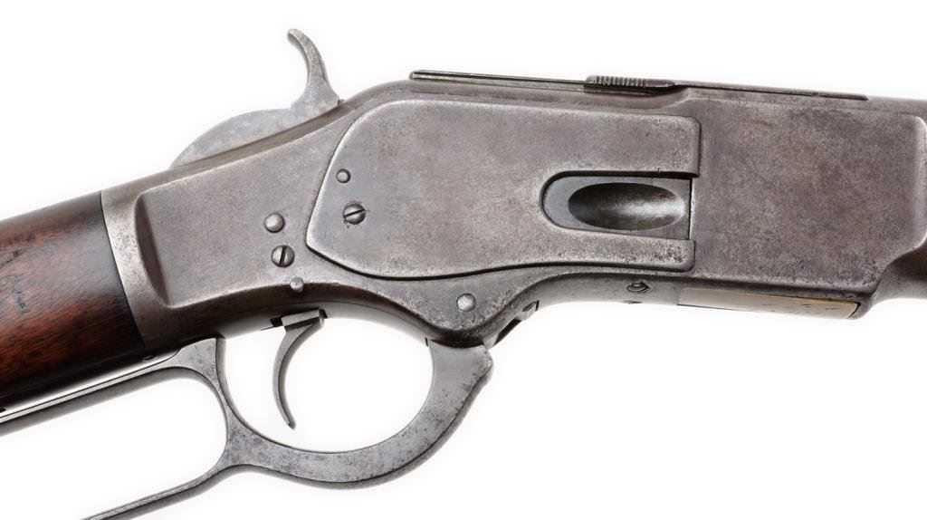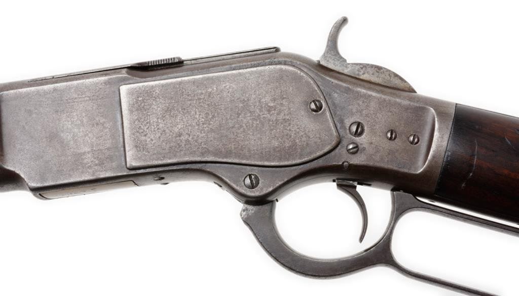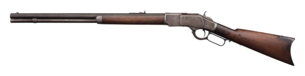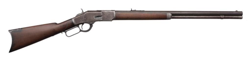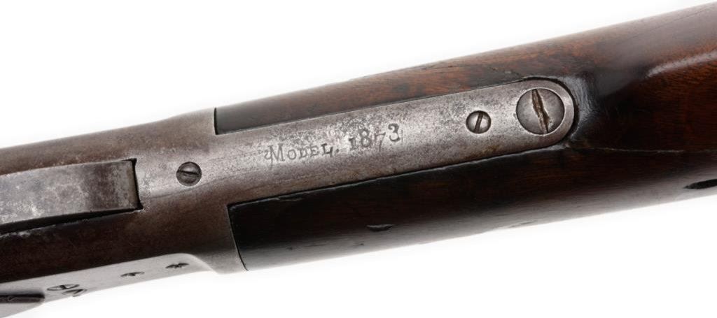 Winchester Model 1873 lever action rifle, .44 W.C.F. caliber, 24” octagon barrel, S/N 76596, blued finish, wood stocks in overall very good condition displaying a mixture of original muted blue and plum patina to the barrel, light patina to the loading tube and grey patina to receiver with some scattered pinprick pitting; very good + bore, crisp action, sharp markings and good + wood with some scattered mars, a repaired old crack on the left side of the butt stock and one also on the right side near the wrist; some oil staining at the iron butt plate. Est.: $1,400-$2,800.