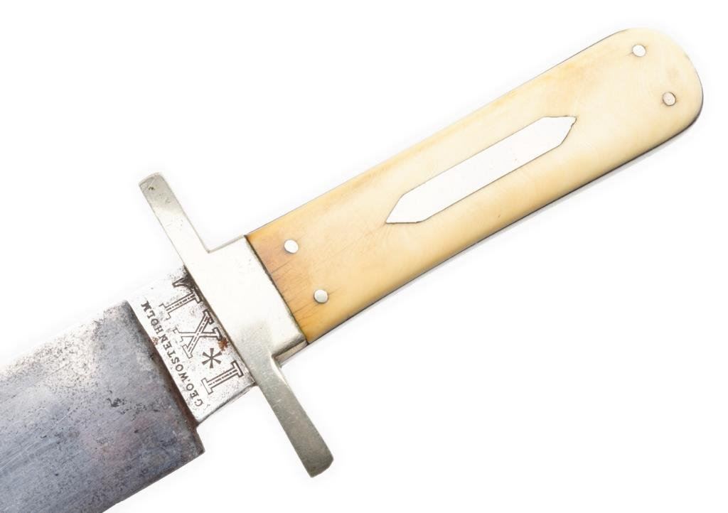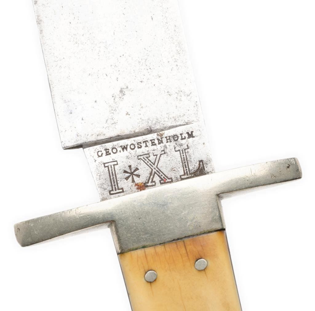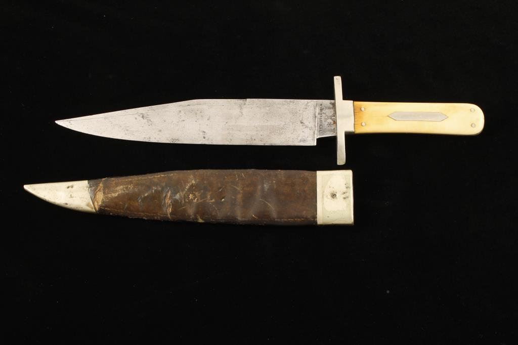 Large IXL Bowie knife with sheath, approximately 11.75” overall with a 7.75” blade etched “GEORGE WOSTENHOLM & SONS CELEBRATED CALIFORNIA KNIFE”; overall very good condition; sheath is overall good with metal throat and tip. Est.: $800-$1,600.