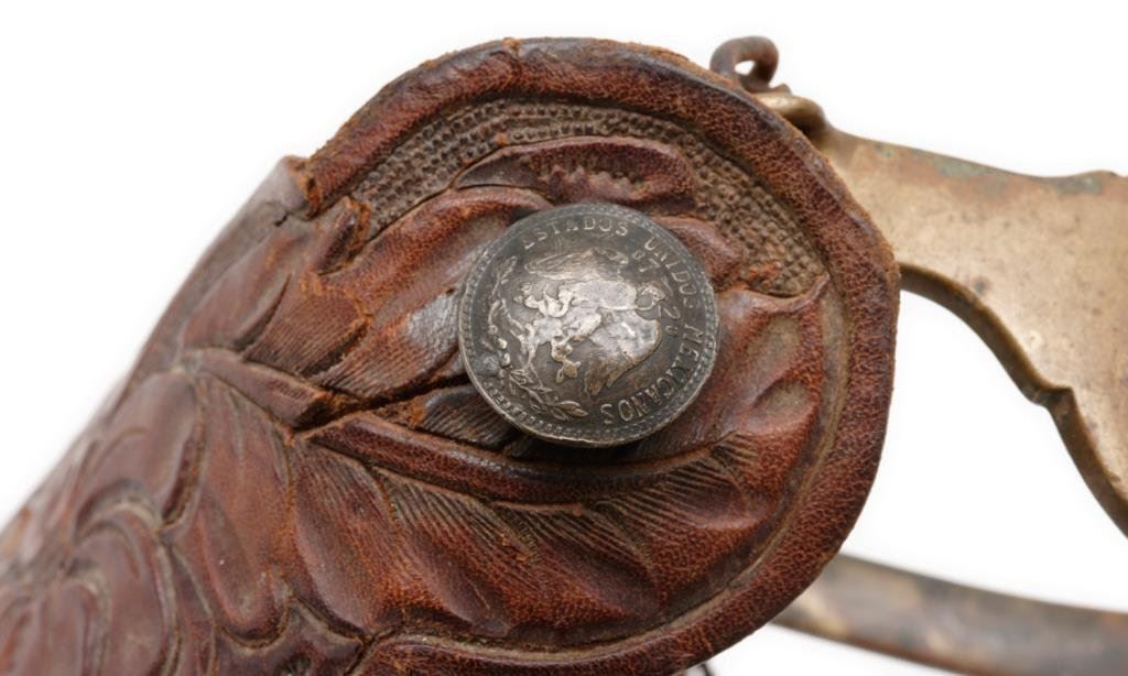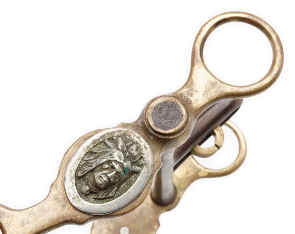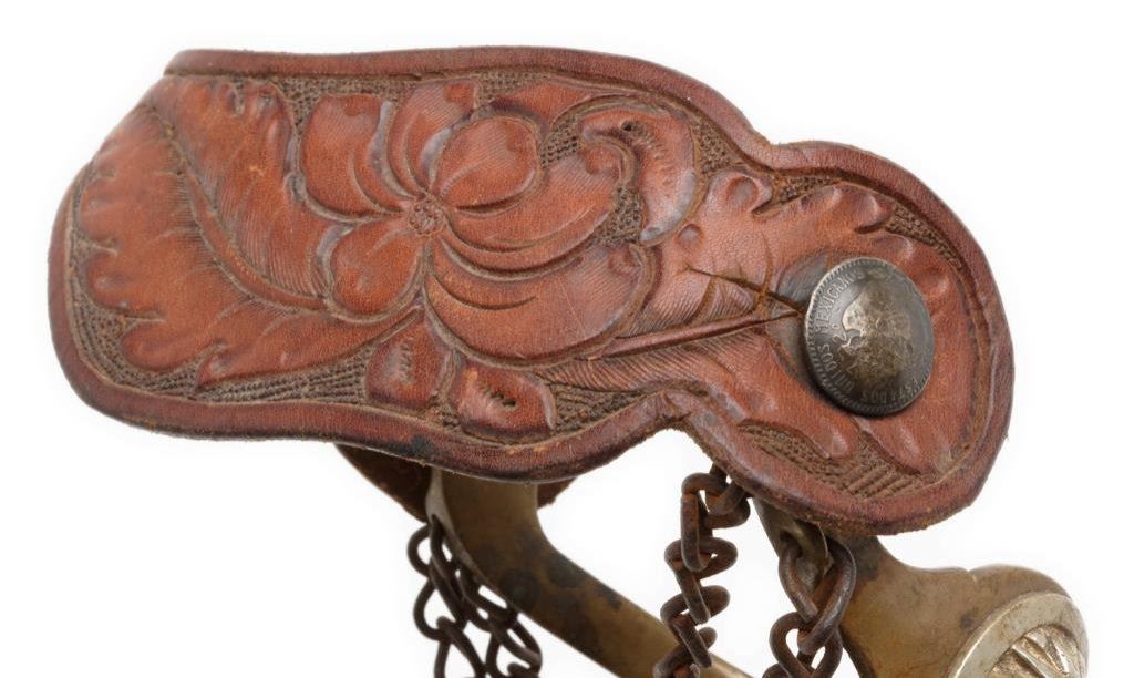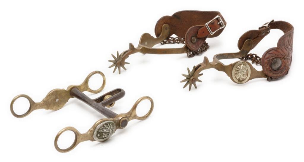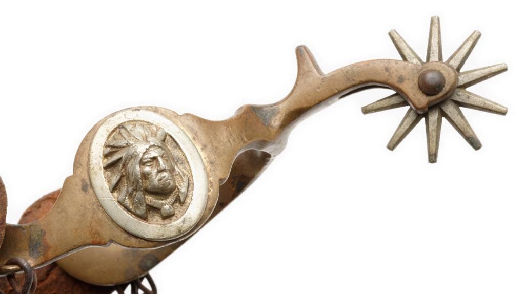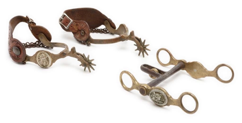 Pair of bronze spurs marked “HERCULES BRONZE” ; 1-3/4” 10 point rowels, raised Indian head overlays on outside heel bands, heel chains and Mexican coin strap retainers; tooled leather straps; accompanied by matching bronze bit. Est.: $450-$900.
