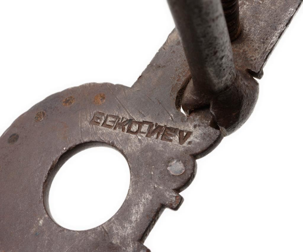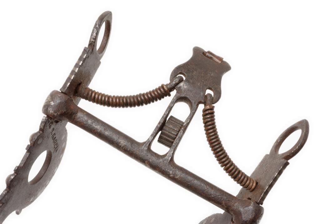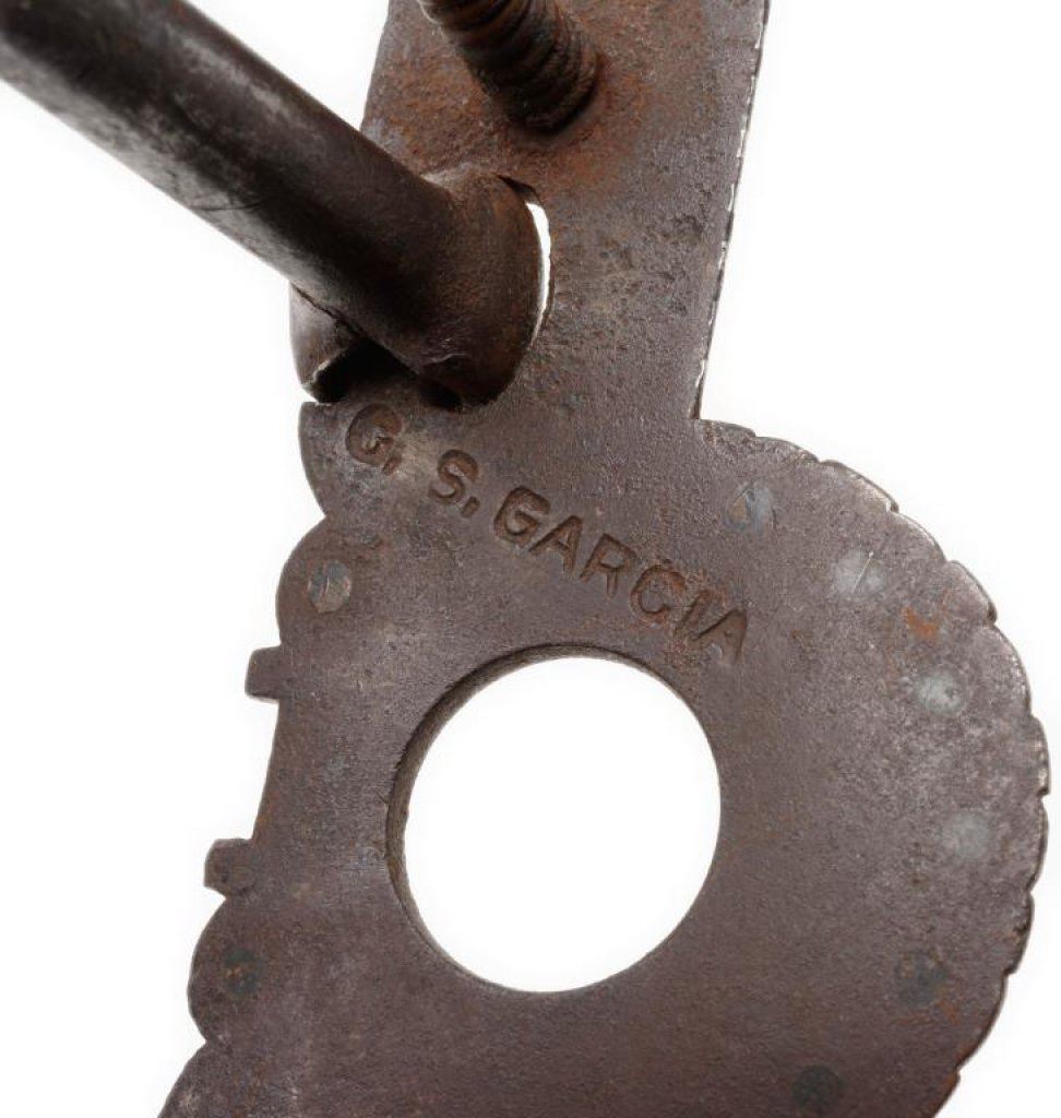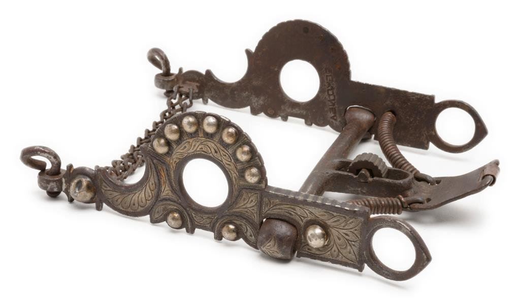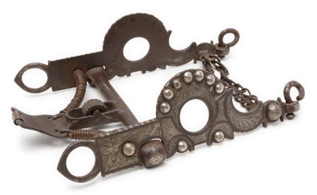 C. S. Garcia engraved silver inlaid bit with buttons and marked “C.S. GARCIA” on the inside of one cheekpiece and “ELKO, NEV” (with reversed “N”) on the inside of the other cheekpiece. A nice older piece with heavy dark patina and by a famous maker’s shop. Est.: $400-$800.