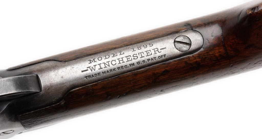 **Winchester Model 1895 lever action takedown rifle, .30 Gov’t 1903 caliber, 24” round barrel, S/N 87865, blued finish, wood stocks. This gun is in overall very good condition with a light grey patina and traces of original blue in protected areas. The action is crisp, the markings are sharp and the bore is near fine. The wood stocks are good to very good with correct ebony insert in front of forend and scattered old mars and dings from carry and storage. Est.: $900-$1,800.