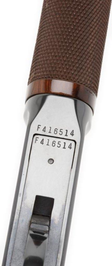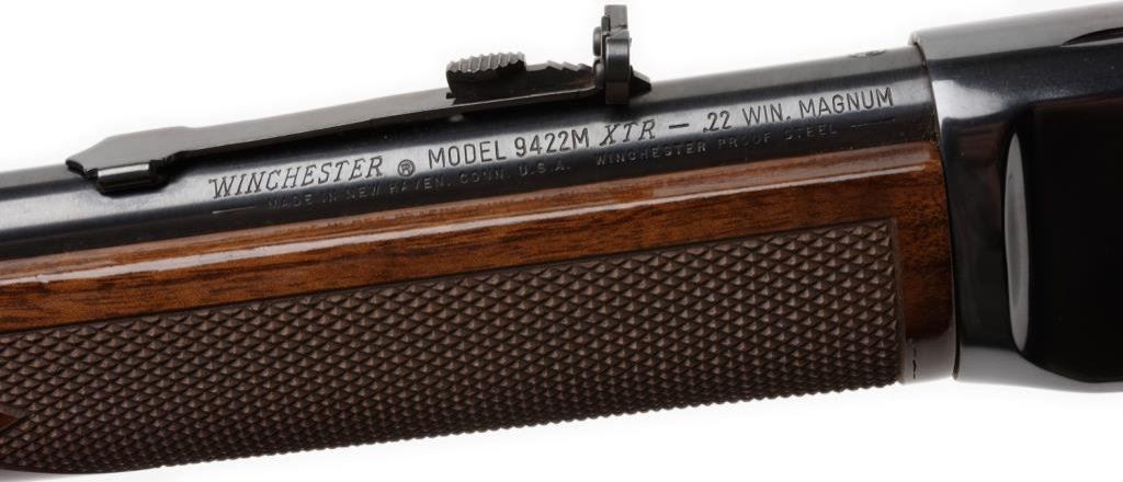 Winchester Model 9422M XTR lever action carbine, .22 Win Magnum caliber, 20” barrel, S/N F416513, blued finish, checkered wood stocks in overall fine condition showing little use or handling; fine bore, action, markings and wood. Est.: $600-$1,200.